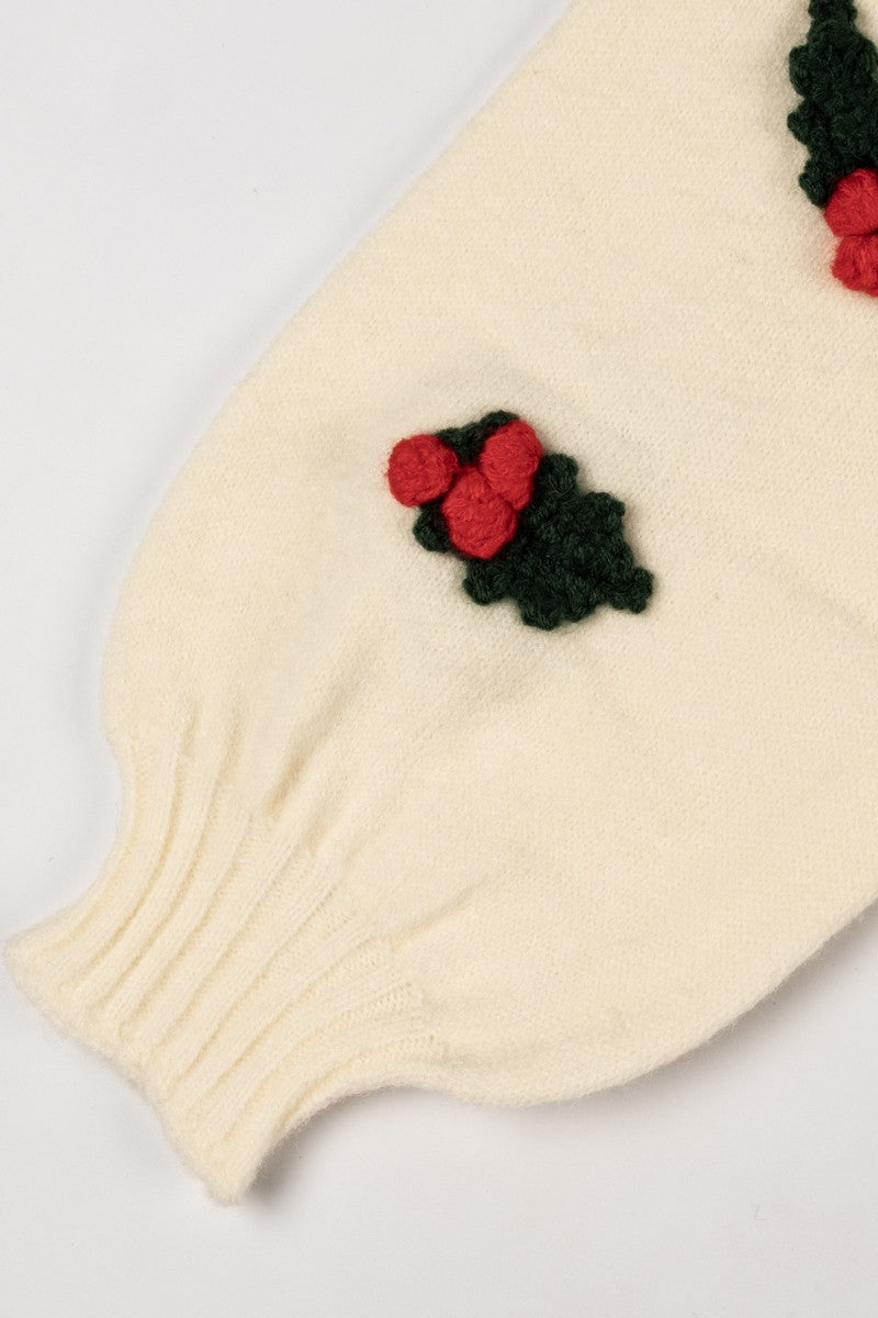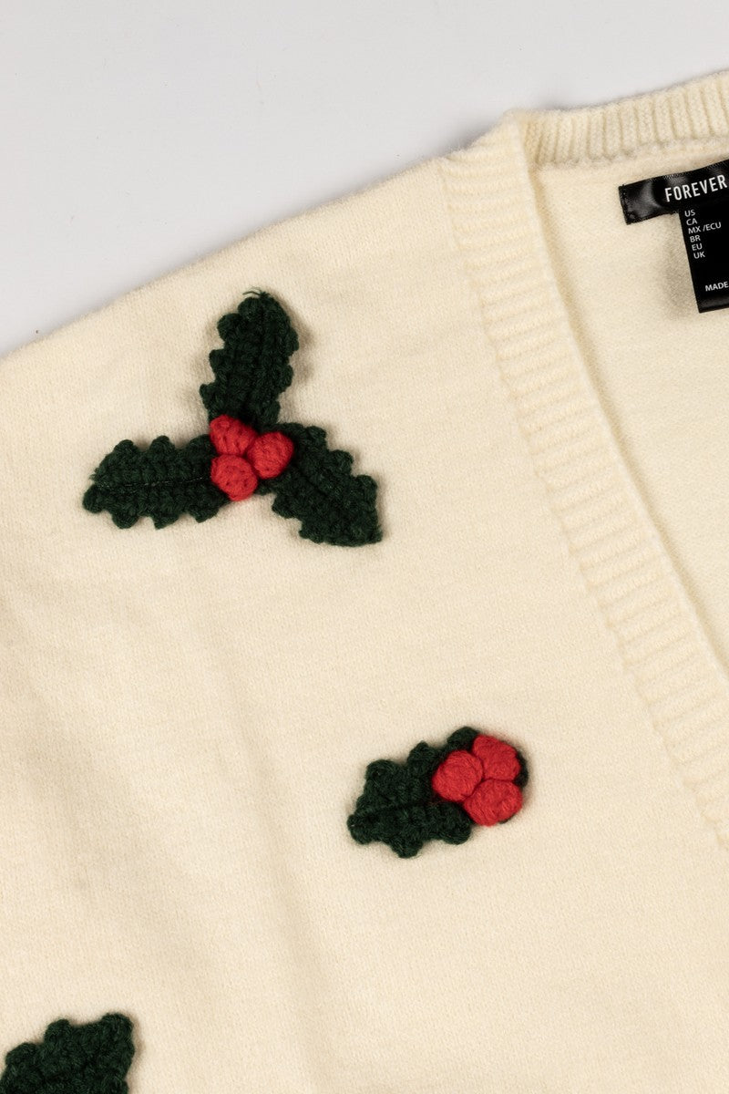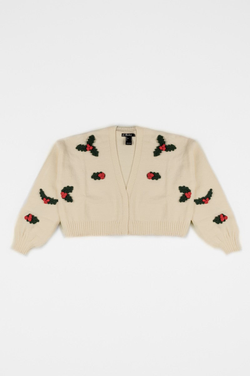 Festive cropped cardigan featuring embroidered holly leaf and berry details