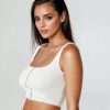 A Ponte knit tube top featuring a seamed construction. exposed hook-and-eye closures. a straight-cut neckline and back. cropped hem. and exposed back zipper closure.