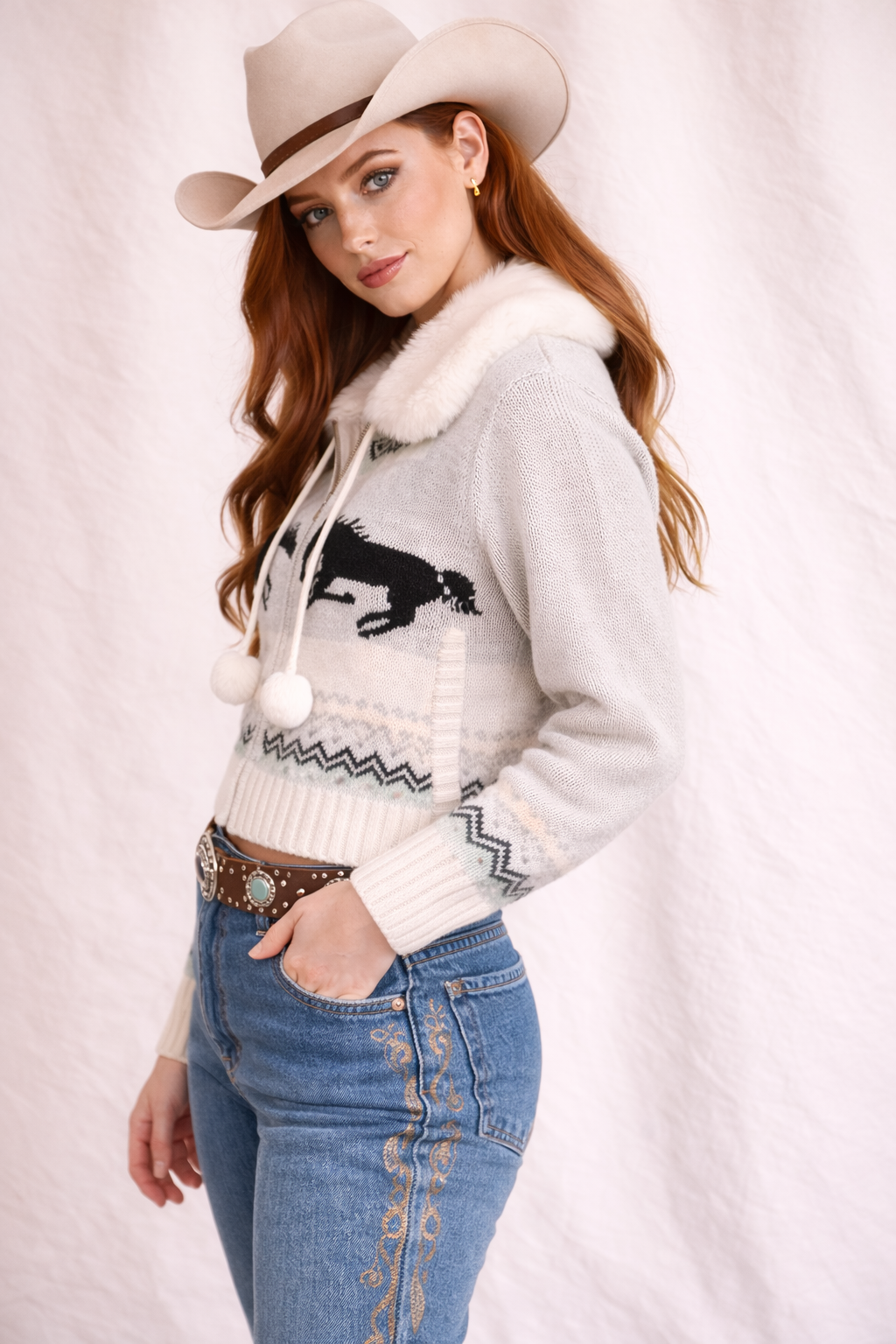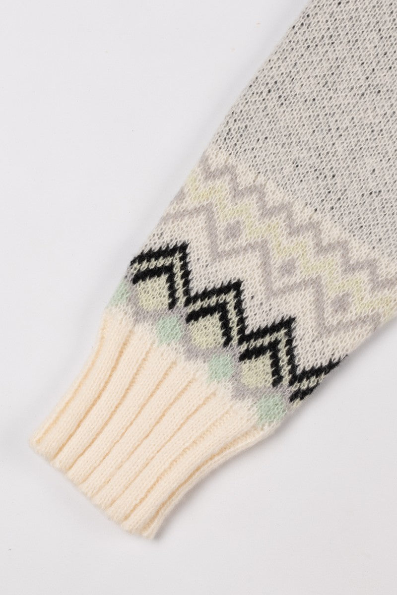 Zip-up knit sweater featuring horse motifs and a Fair Isle pattern