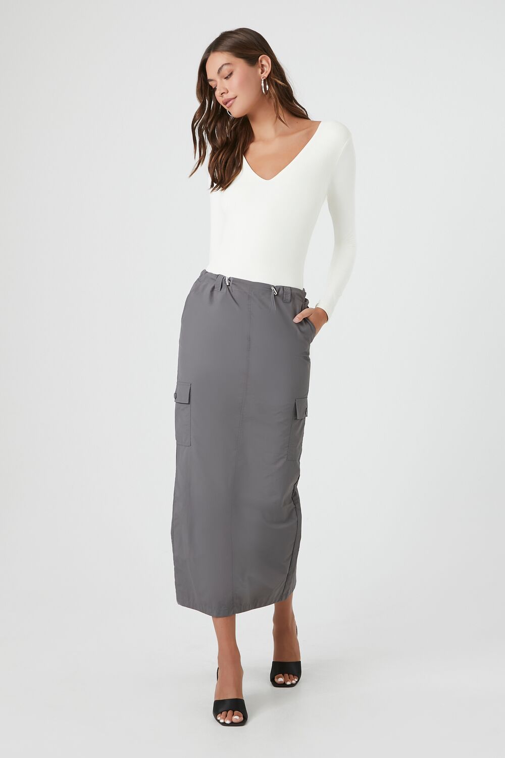 A jersey knit bodysuit featuring a V-neckline. long sleeves. and a fitted silhouette.