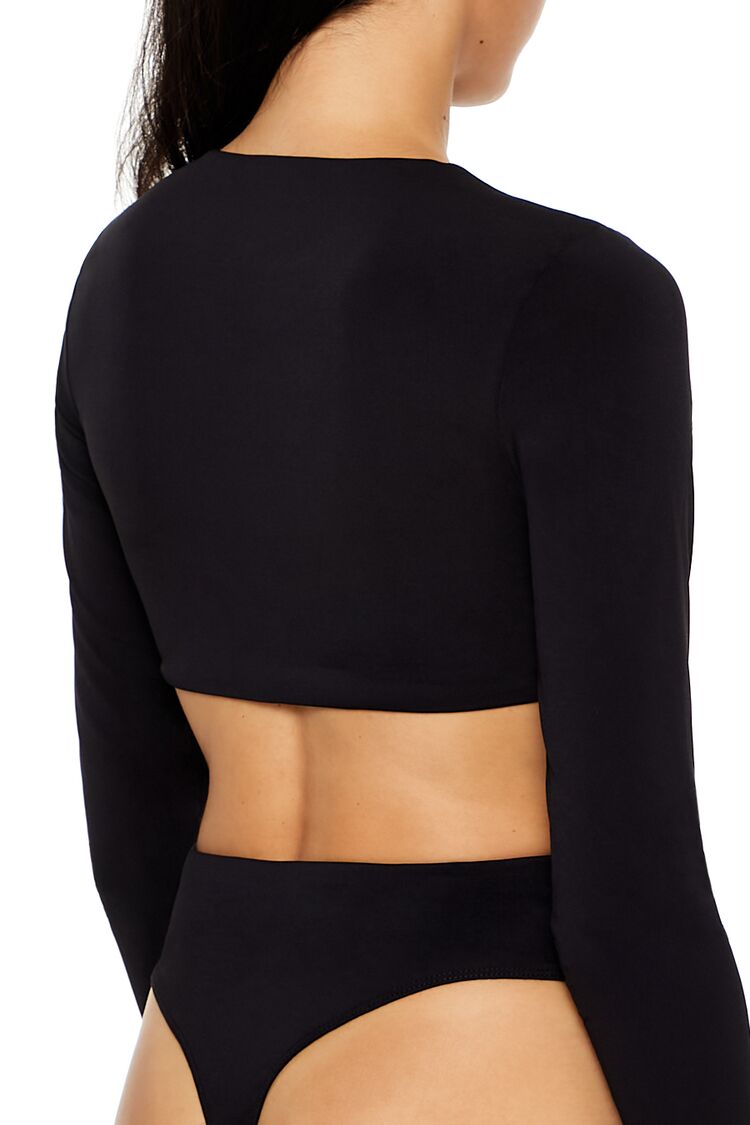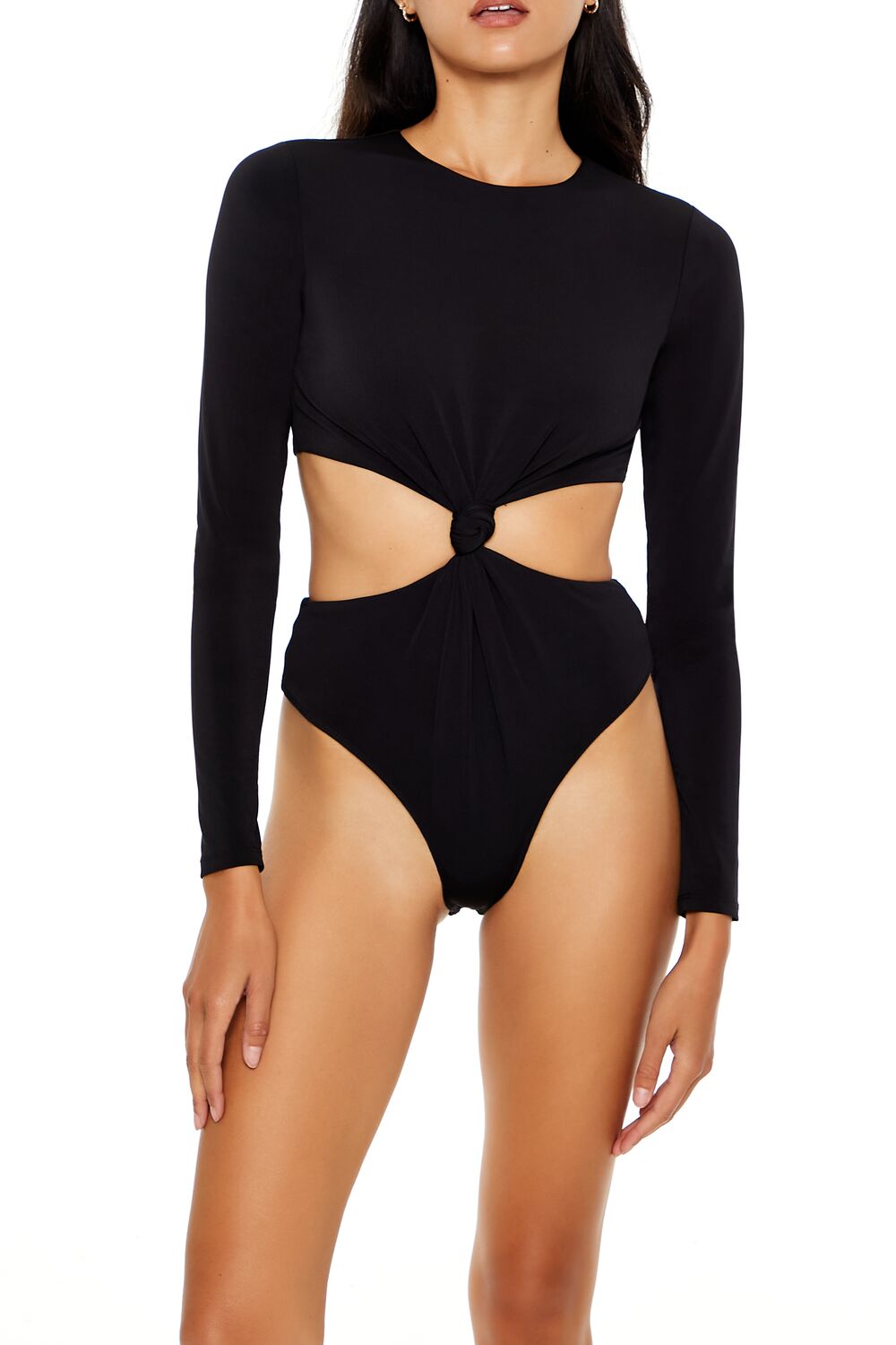 A knit bodysuit featuring a round neckline. long sleeves. cutouts. and a knotted front design.