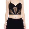 A knit lace tube top featuring a straight-cut neckline and back. fitted silhouette. cropped silhouette. and sheer back construction.