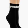 A woven crop top featuring shoulder straps. scalloped lace trim. a square-cut neckline and back. hook-and-eye front closures. corset-inspired design. and a crochet lace hem.