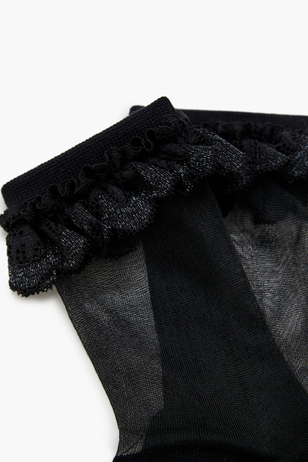 A pair of sheer mesh crew socks featuring ruffle lace trim.