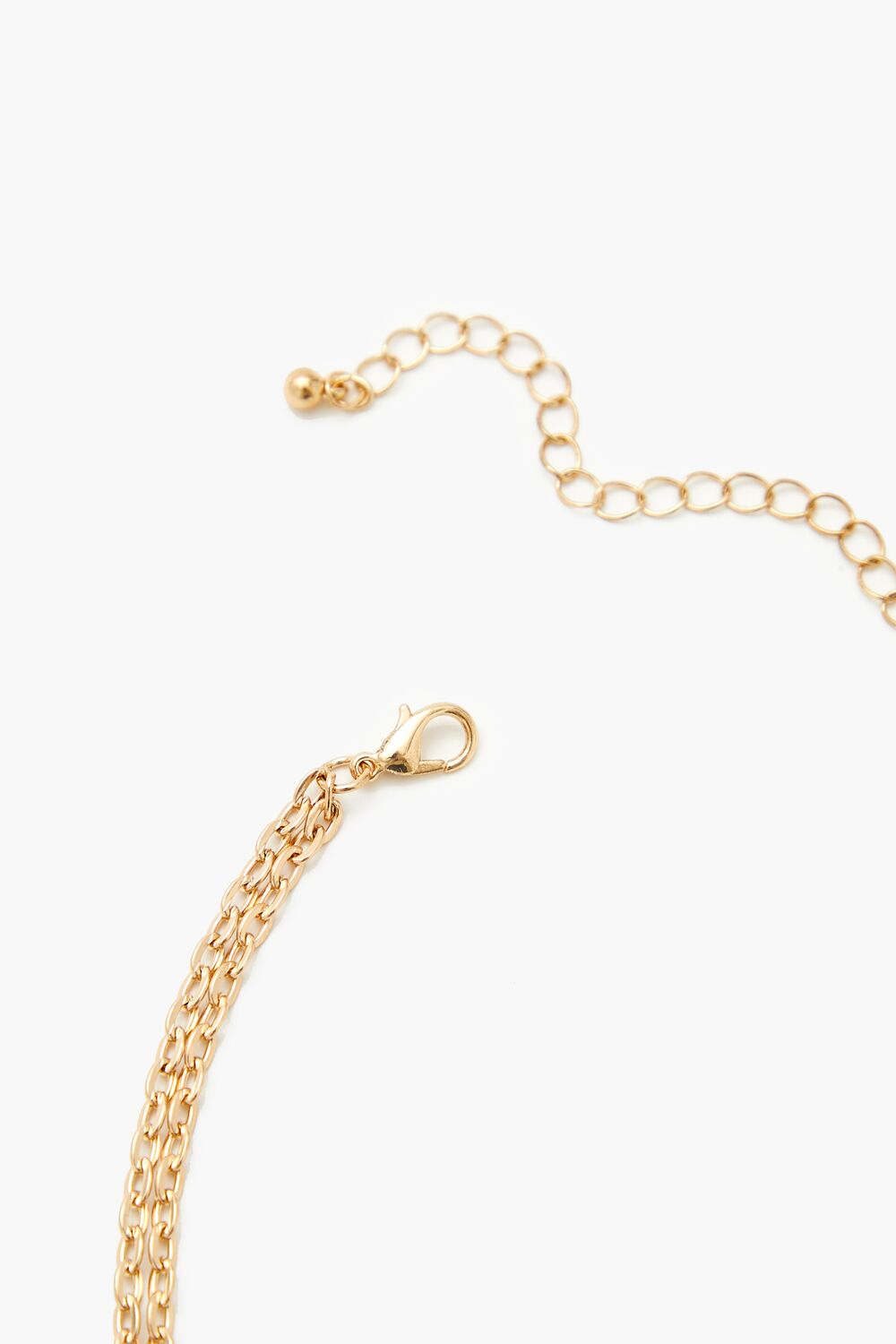 A high-polish layered necklace featuring cable chains. an etched pendant with faux gem embellishments. and lobster-clasp closure.