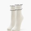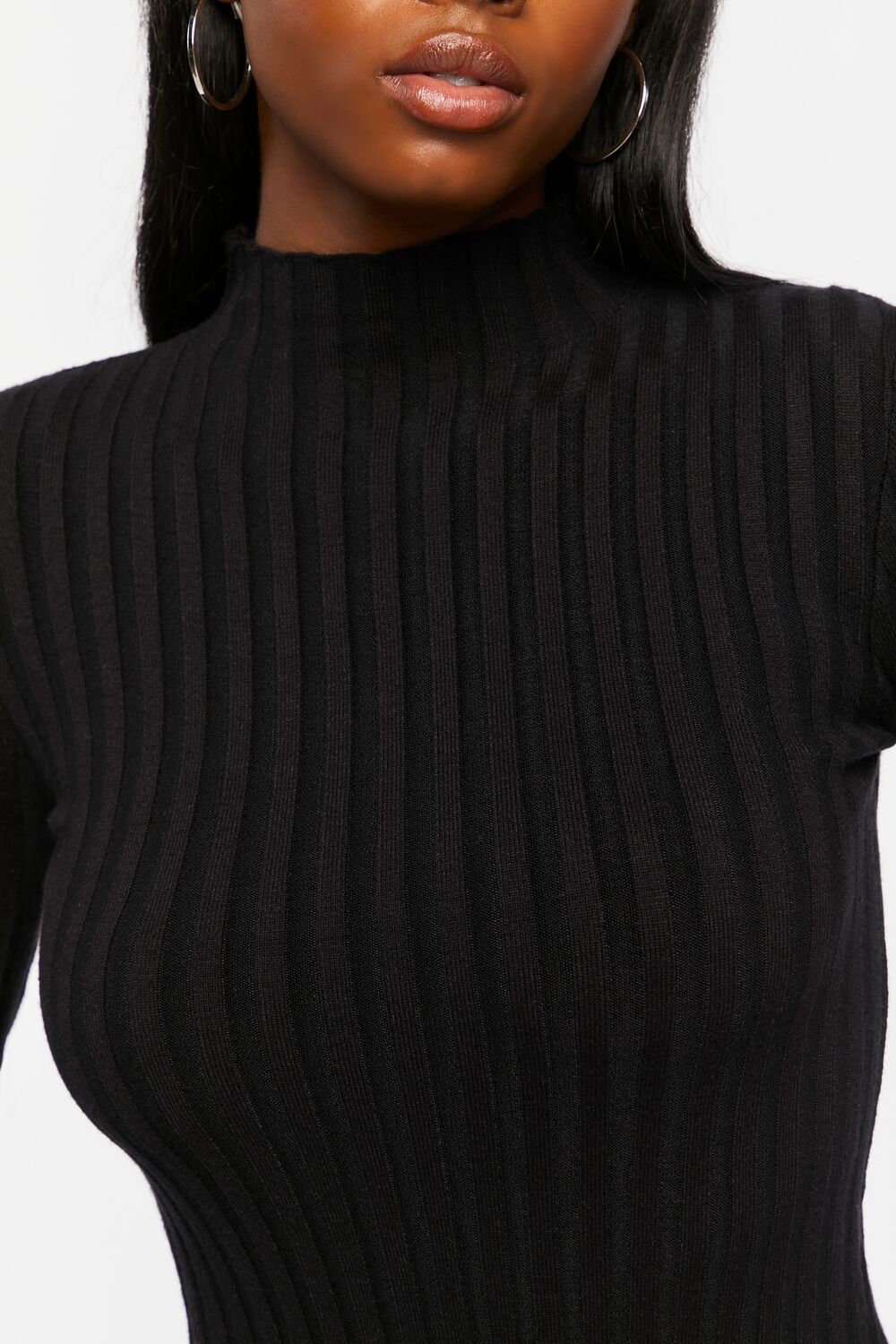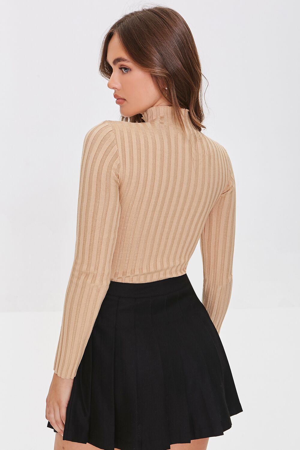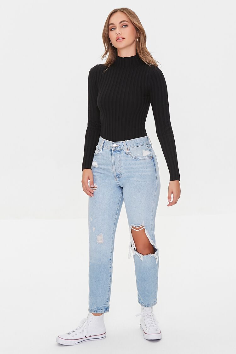 A wide-ribbed sweater-knit bodysuit featuring a mock neck. long sleeves. lettuce-edge trim. and a cheeky bottom with snap-button closures.