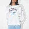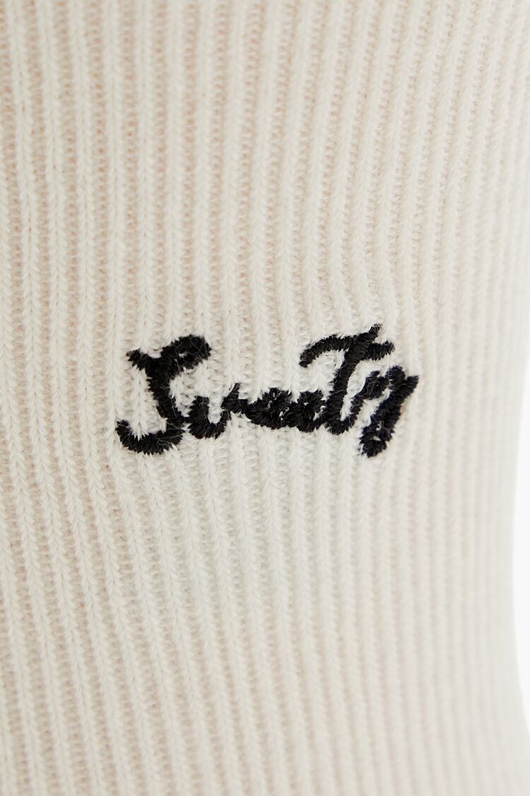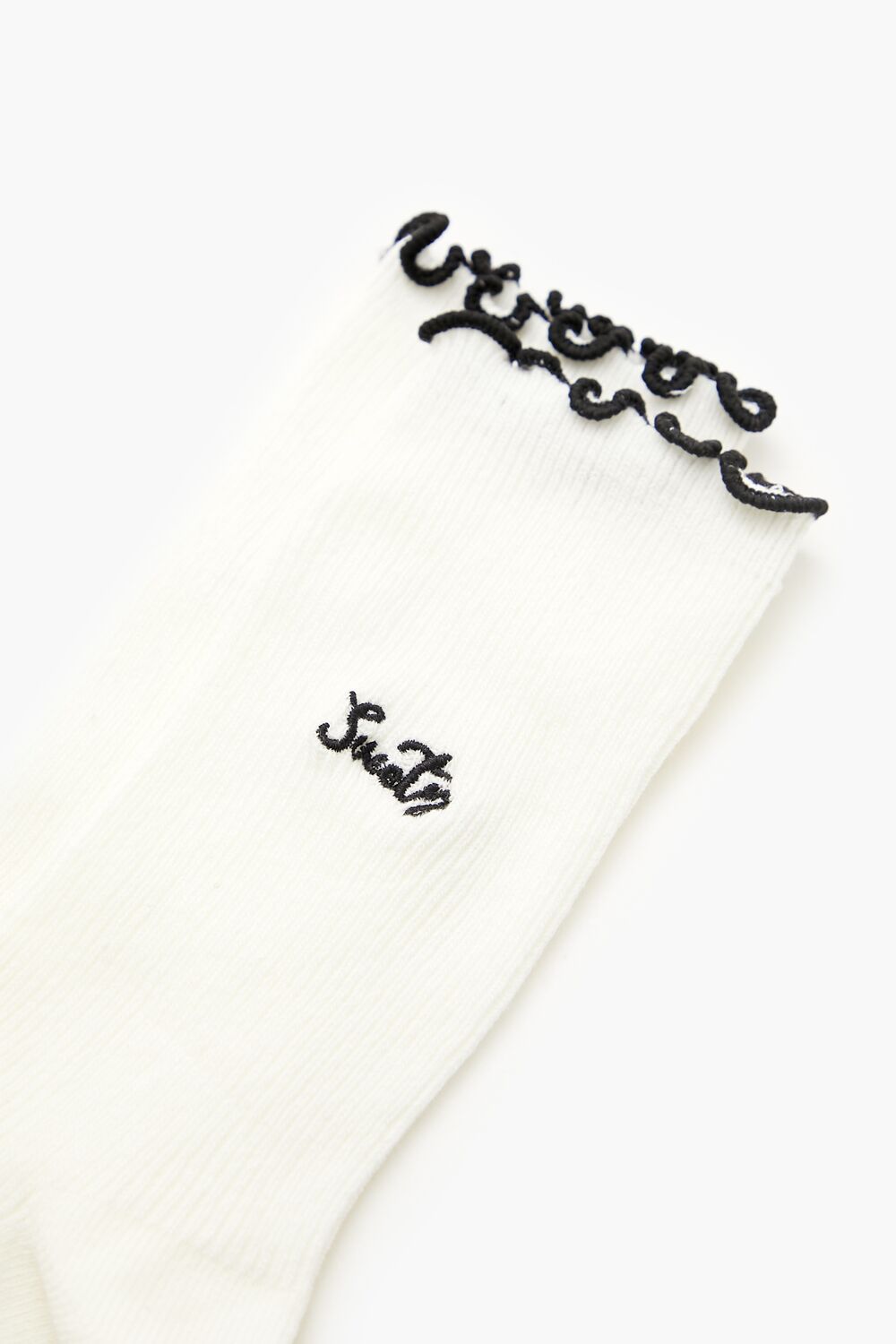 A pair of ribbed knit crew socks featuring lettuce-edge trim and embroidered ‘Sweety’ text.