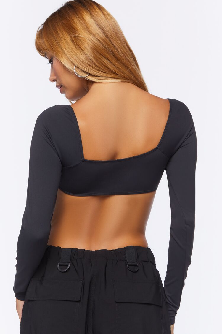 A knit crop top featuring a square neck. underwire. and long sleeves.