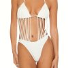 A macrame bralette bikini top featuring braided trim. a sweetheart neckline. fixed cami straps with draped detailing. and back self-tie closure.