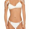 A macrame monokini one-piece swimsuit featuring a halter neckline. caged front design. high leg. open back with dual self-tie closures. and cheeky cut.