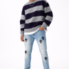 • Light-wash denim with heavy all-over distressing for a rugged. worn-in look