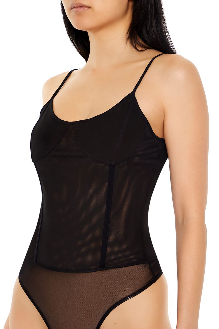A mesh knit bodysuit featuring a V-neckline. bustier-inspired design. adjustable cami straps. and a thong cut bottom.