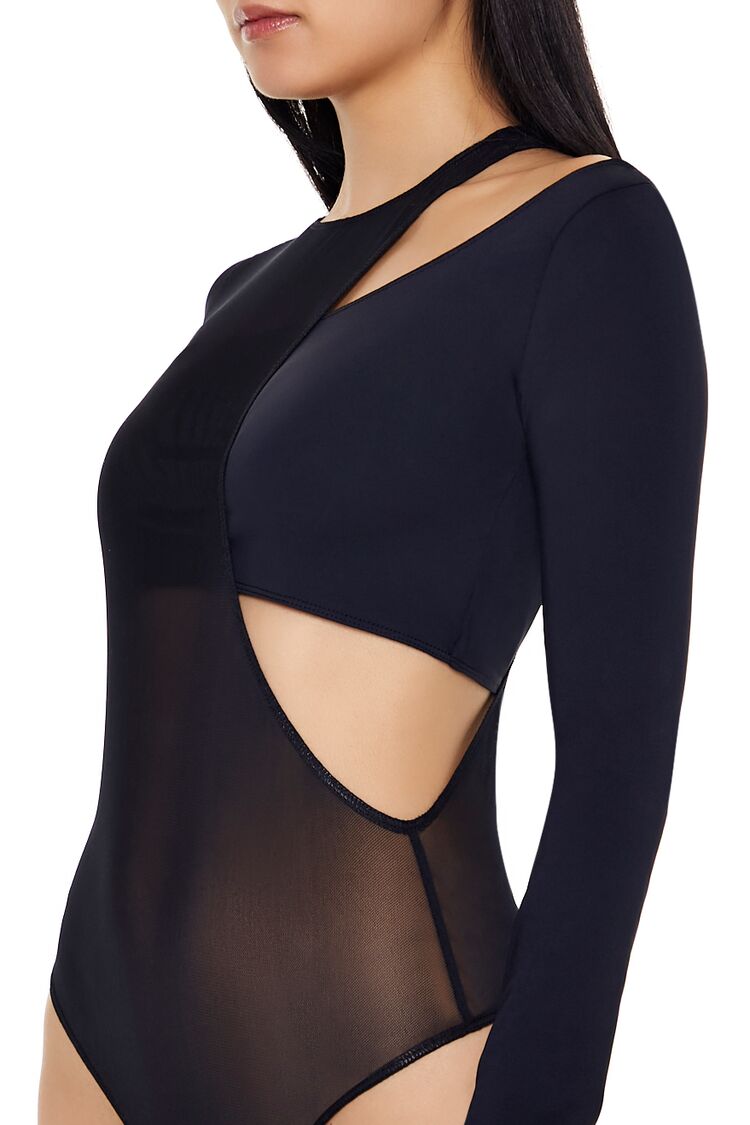A knit bodysuit featuring a combo design. partial sheer construction. round neckline. long sleeves. and a cutout design.