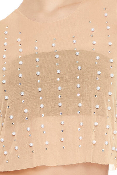 A mesh knit tank top featuring allover faux pearl and rhinestone embellishments. a round neckline. sheer construction. and cropped hem.
