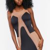 A mesh halter top featuring a plunging V-neckline. open back. back self-tie closures. cropped silhouette. lettuce-edge trim. and a sheer flounce V-hem.