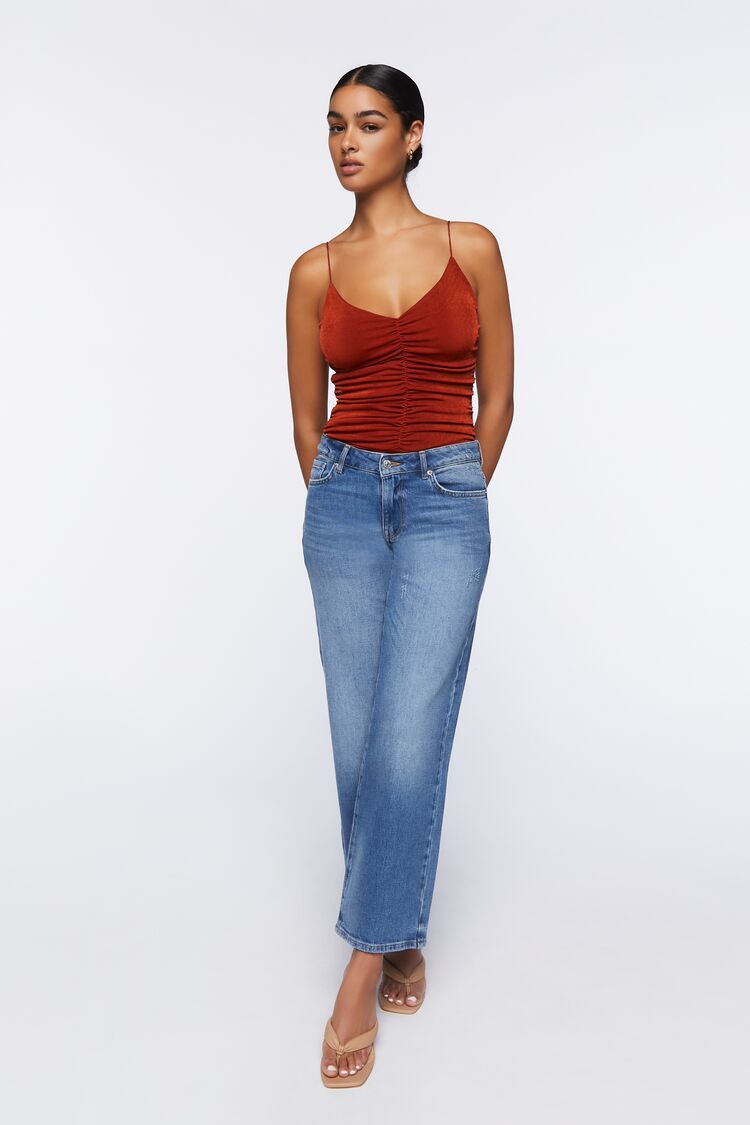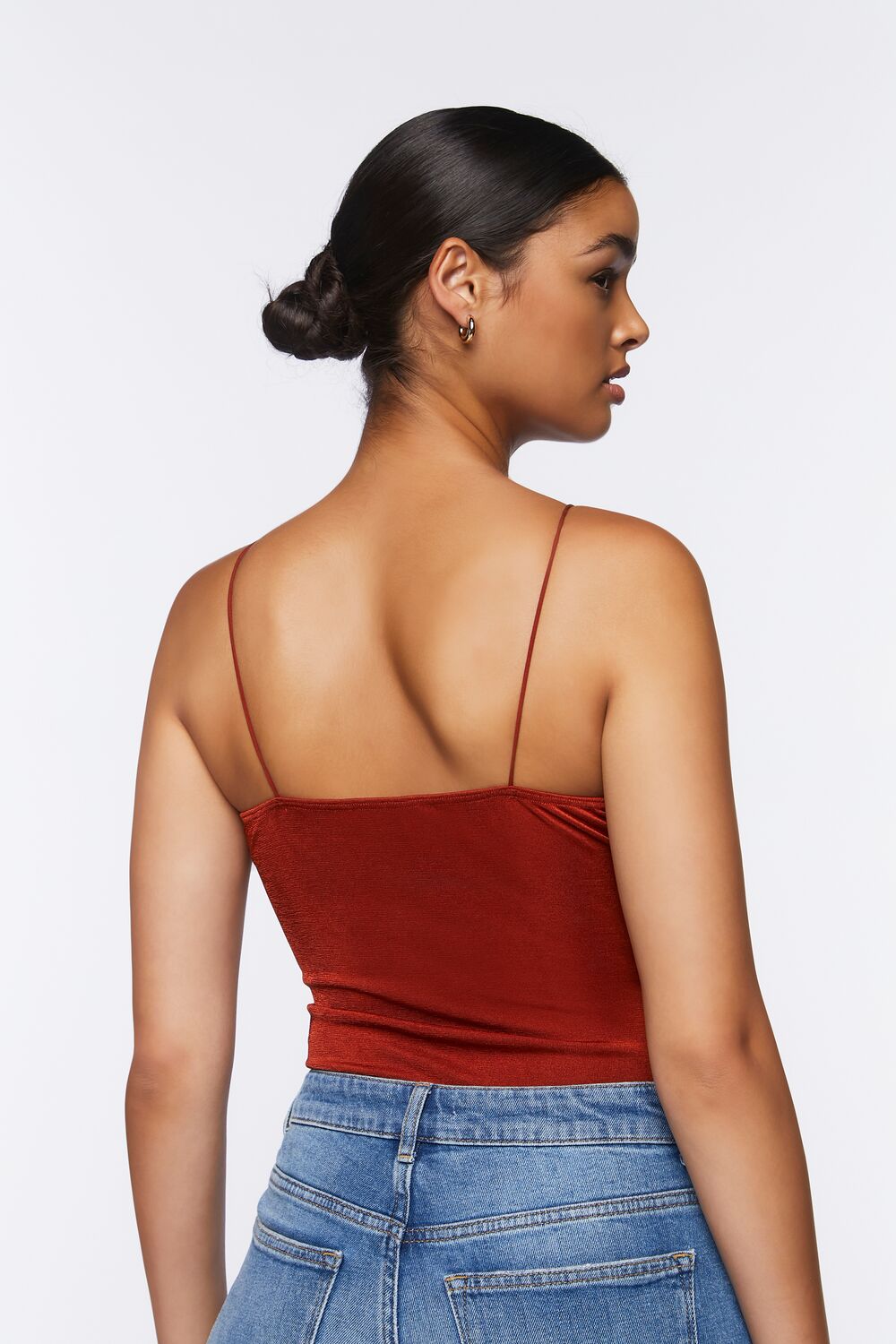 A mesh bodysuit featuring a ruched construction. fixed cami straps. straight-cut back. and a V-neckline.