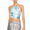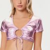 A metallic babydoll dress featuring a sweetheart neckline. ruffle trim. adjustable cami straps. back cutout. self-tie back with statement bow. and mini length.
