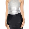 Crafted from non-stretch denim. this mini skirt features an allover metallic finish. denim print. mid-rise waist. belt loops. zip fly and button-front closure. slanted front pockets. back patch pockets. and A-line silhouette.