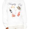 A French terry pullover featuring ribbed trim. a crew neck. chest ‘Naughty’ text. accompanying Stitch character with Christmas string lights graphic. and dropped long sleeves.