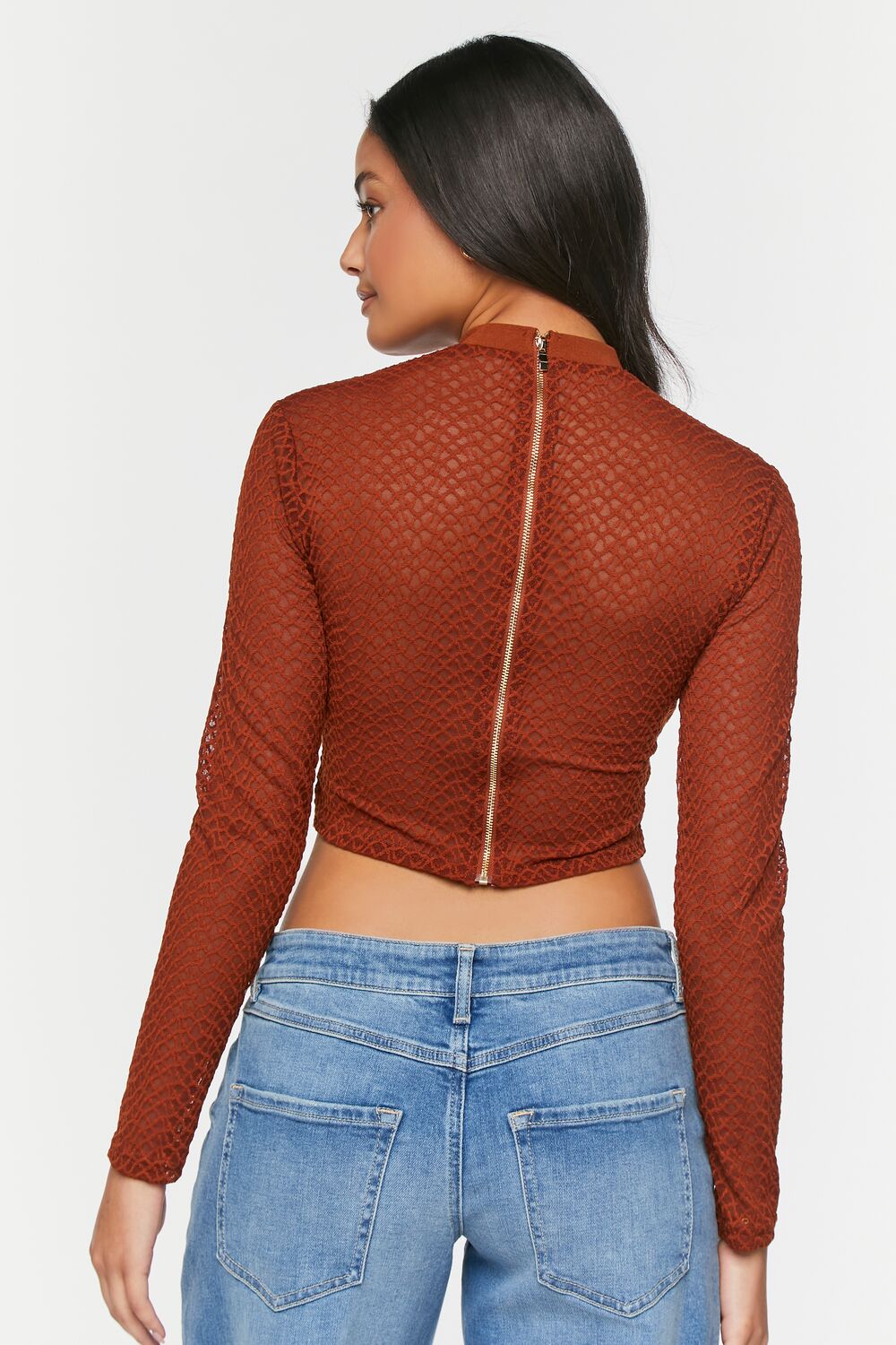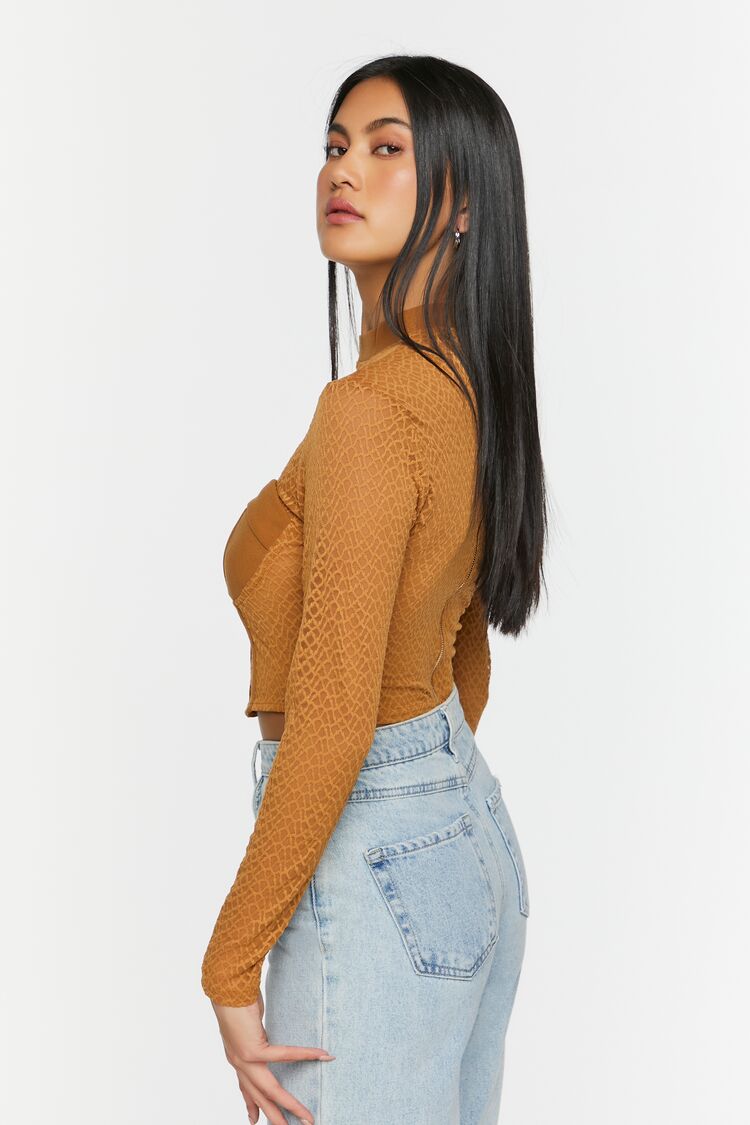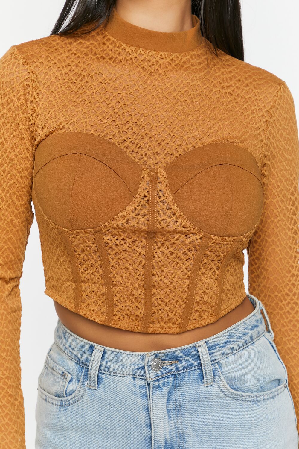 A mesh top featuring a netted construction. mock neck. bustier design. seam detailing. long sleeves. exposed back zipper. and semi-cropped curved hem.
