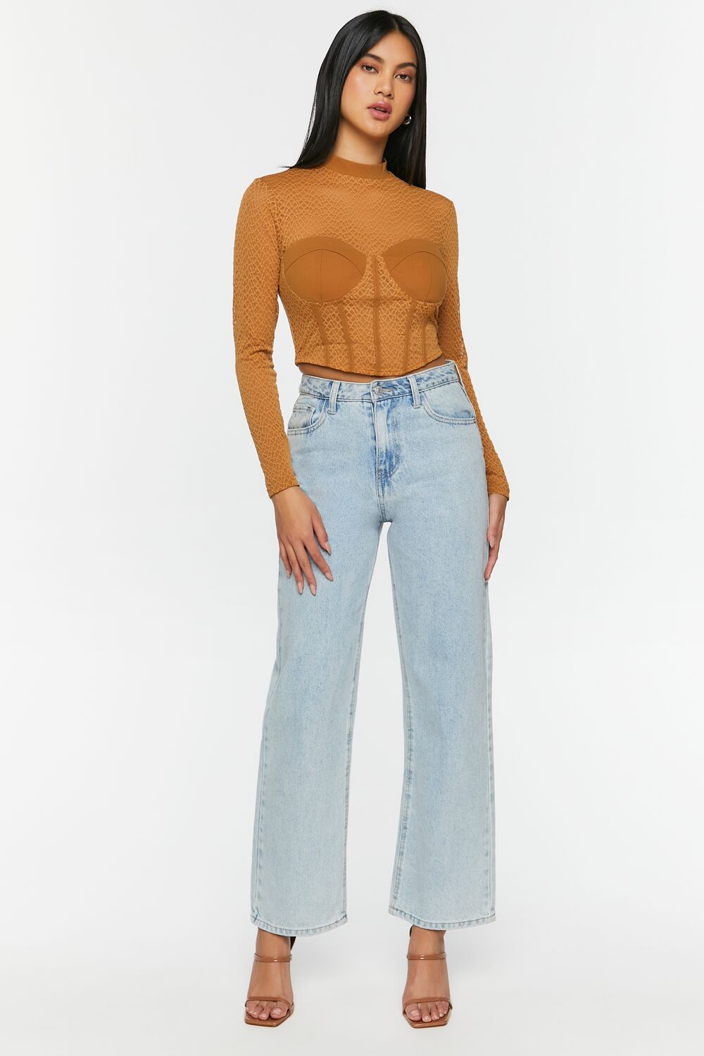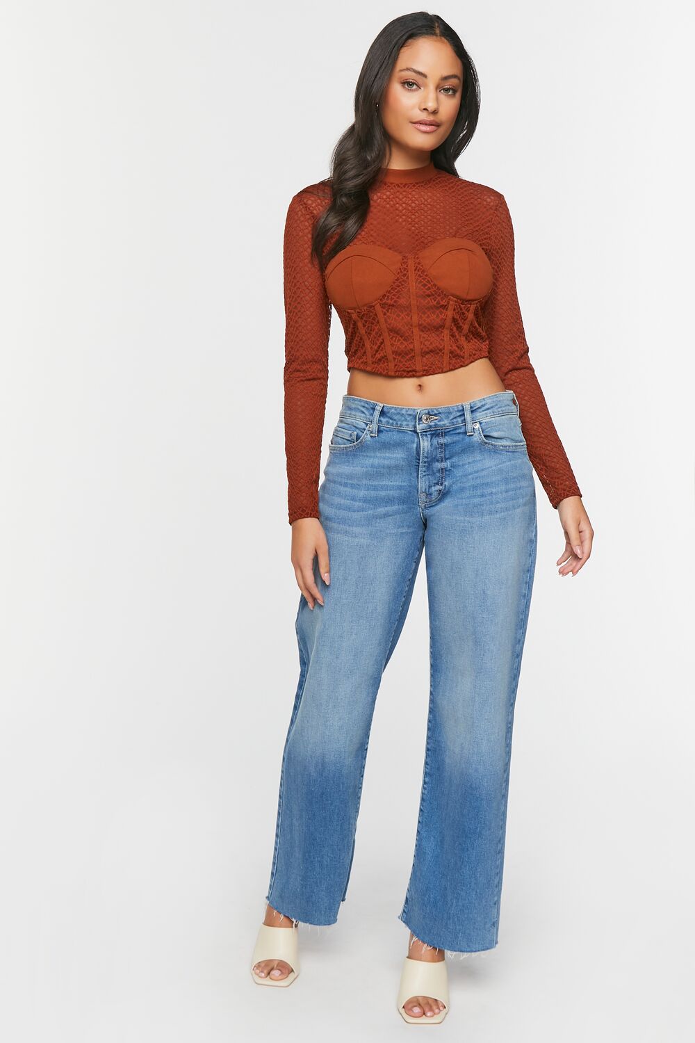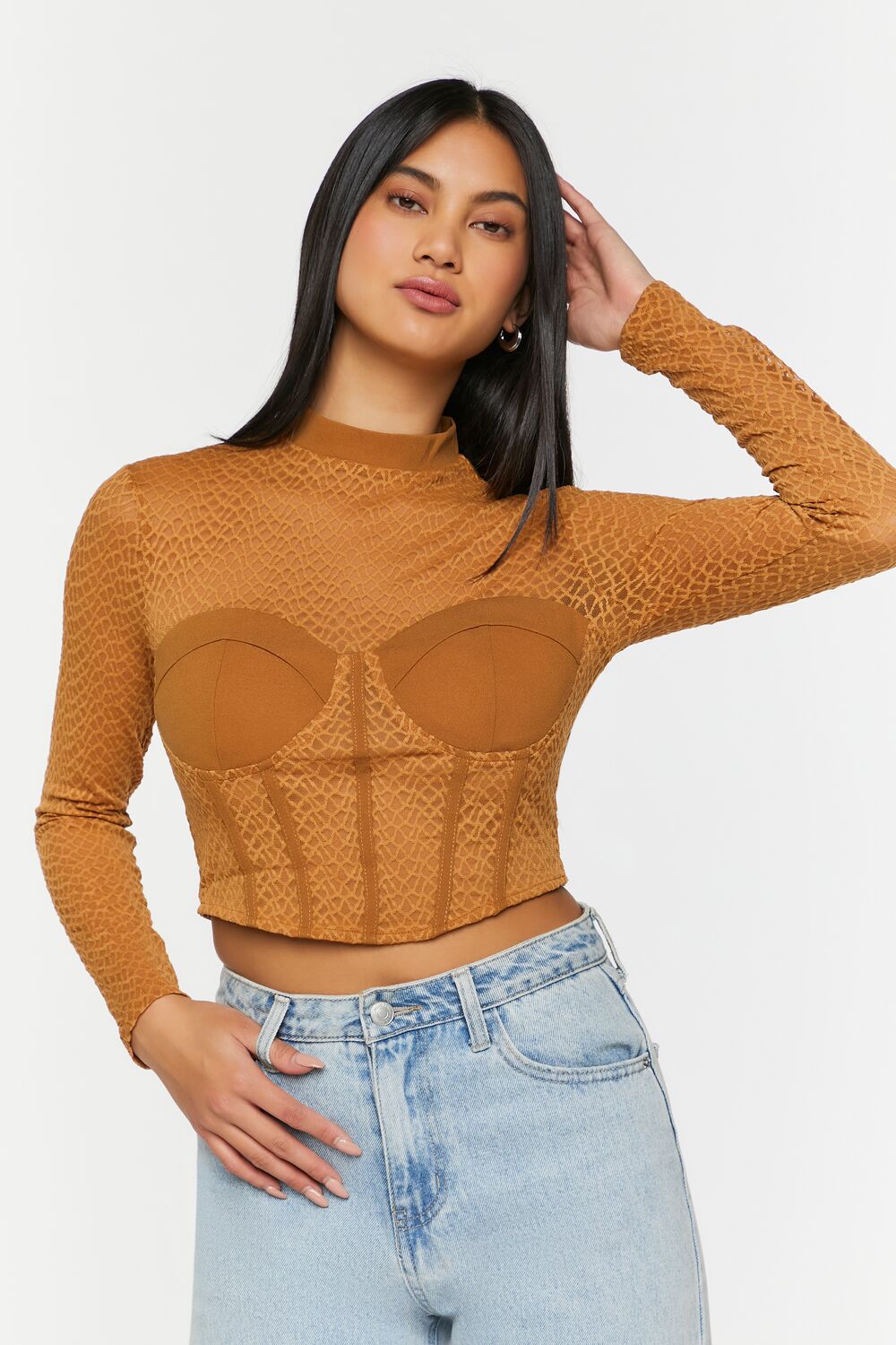 A mesh top featuring a netted construction. mock neck. bustier design. seam detailing. long sleeves. exposed back zipper. and semi-cropped curved hem.