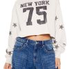 A jersey knit combo tee featuring an allover heathered construction. round neckline. chest ‘New York’ and ’89’ text. long sleeves. and lettuce-edge cropped hem.