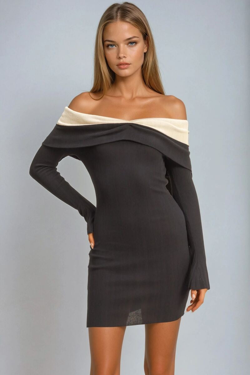Off-The-Shoulder Contrast-Trim Mini Dress