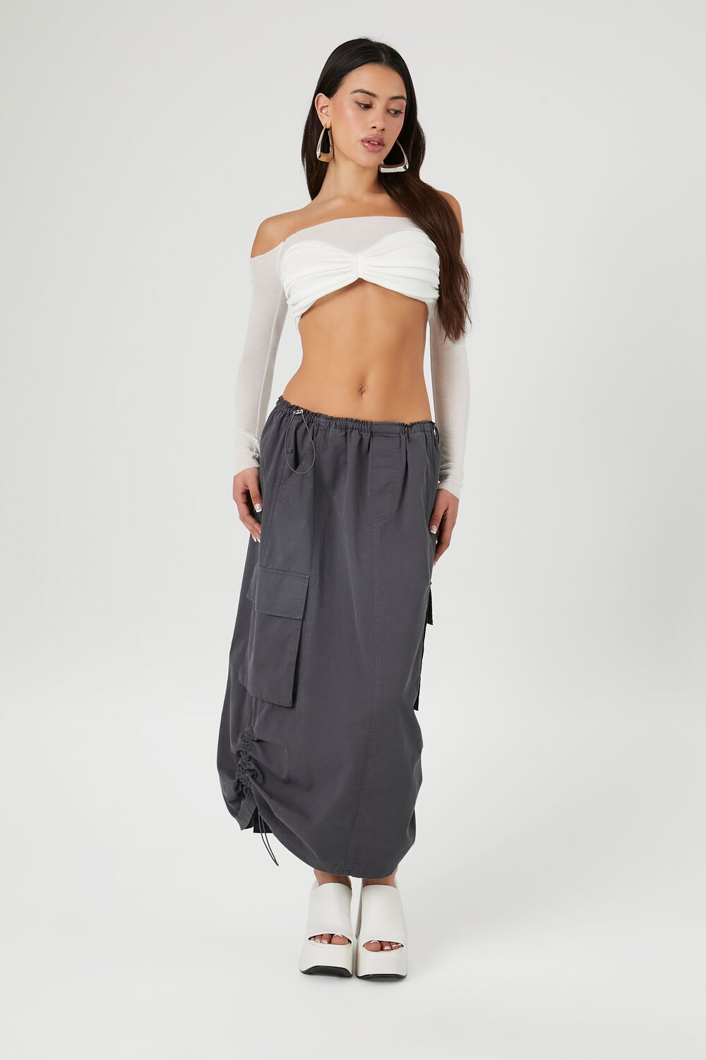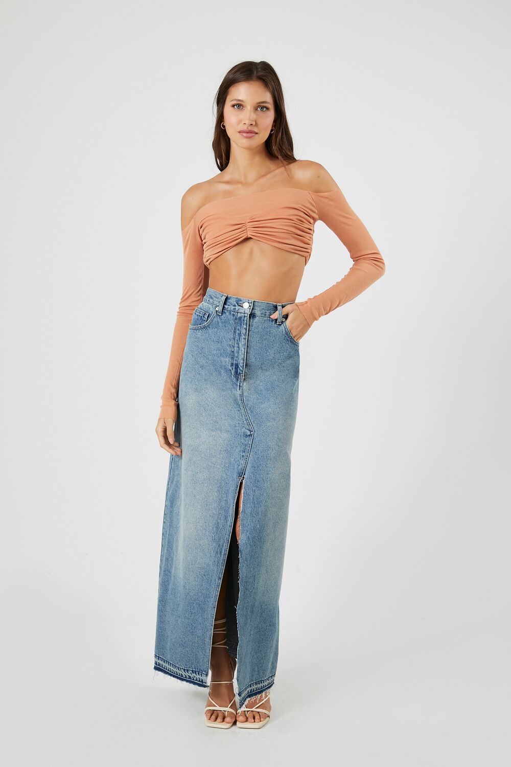 A ribbed knit crop top featuring an off-the-shoulder neckline. long sleeves. raw-cut trim. and a ruched bust.