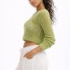 A knit sweater featuring a partial open-knit construction. a square-cut neckline. bell sleeves. and scalloped trim.