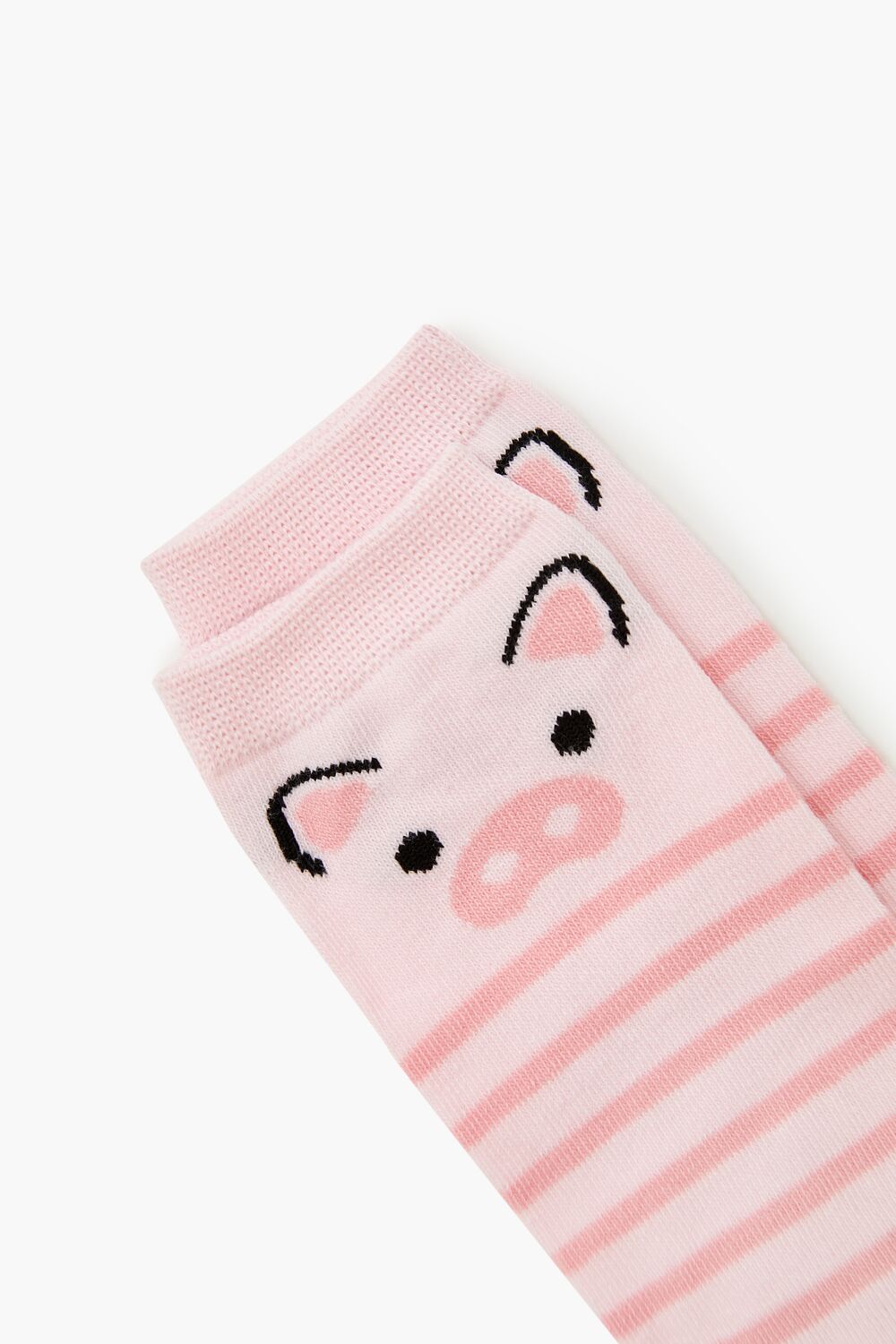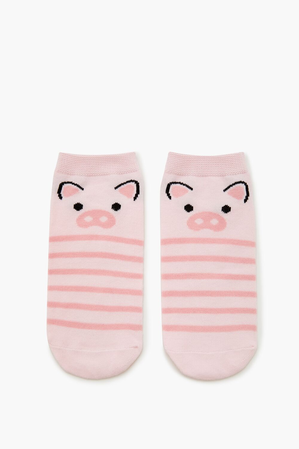 A pair of knit ankle socks featuring a pig graphic and ribbed trim.