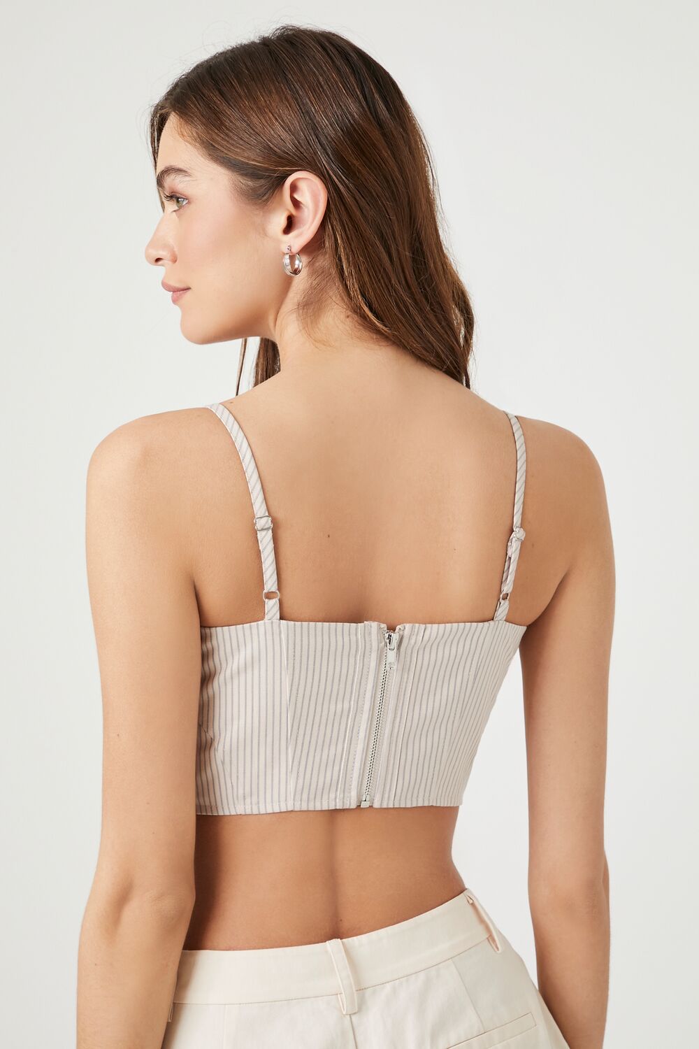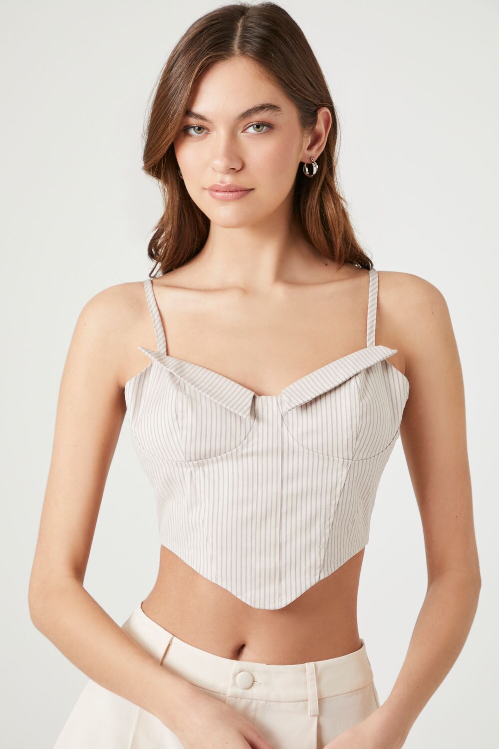 A woven cropped cami featuring an allover pinstriped pattern. foldover sweetheart neckline. adjustable straps. a bustier design. curved front hem. straight-cut back. and a concealed back zipper.