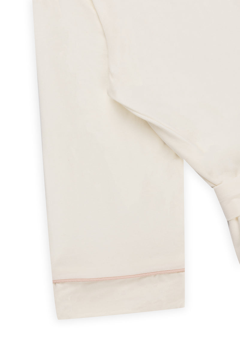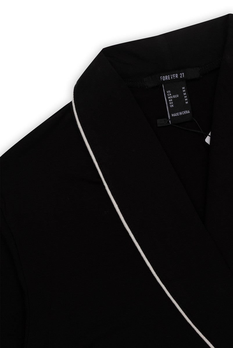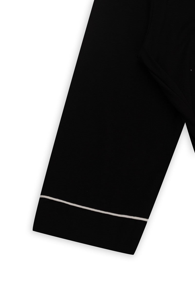 Three-quarter sleeves with matching piped cuffs for a polished silhouette
