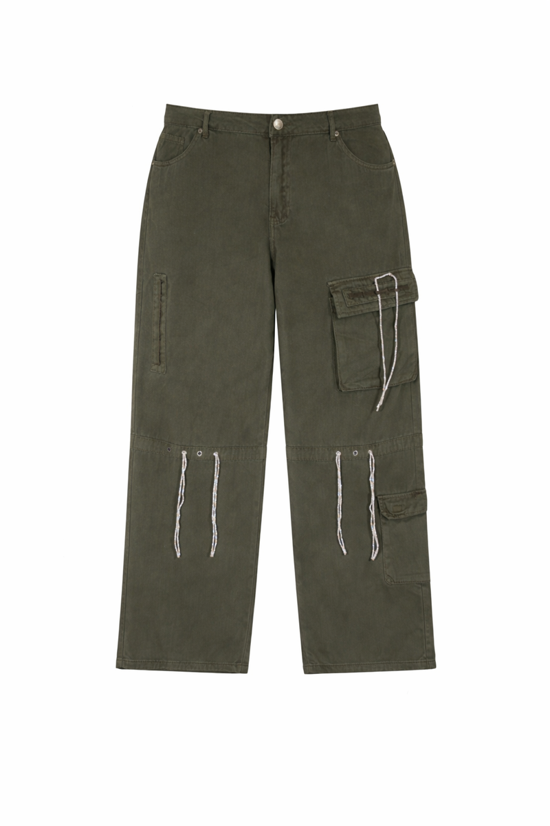 • Cargo pockets adorned with glittery string accents and silver grommet details