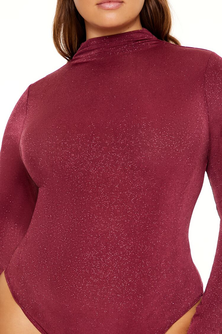Forever 21+ – A glitter knit bodysuit featuring a cowl high neckline. long sleeves. and thong bottom cut.