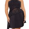 Forever 21+ – A mesh tube dress featuring allover rhinestone embellishments. a ruched construction. straight-cut neckline and back. side rosette embellishment and dangling ruffle trim. layered flounce hem. mini length. and bodycon silhouette.