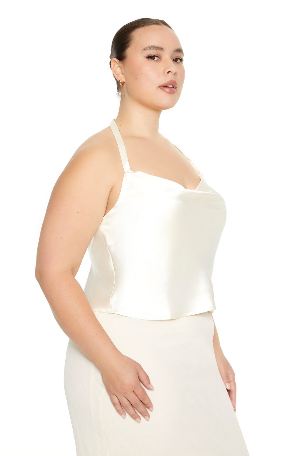Forever 21+ – A satin top featuring a halter cowl neckline. cropped hem. and an open back.