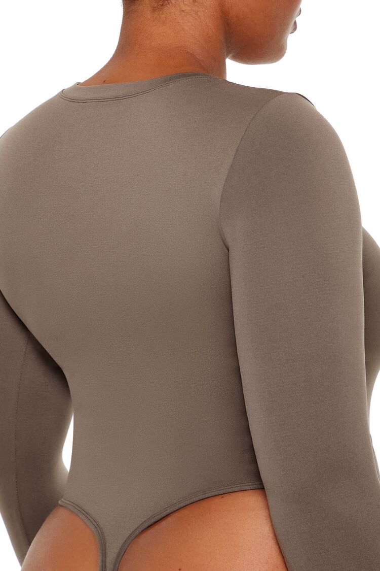 Forever 21+ – A seamless knit bodysuit featuring a round neckline. long sleeves. and thong bottom cut.