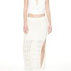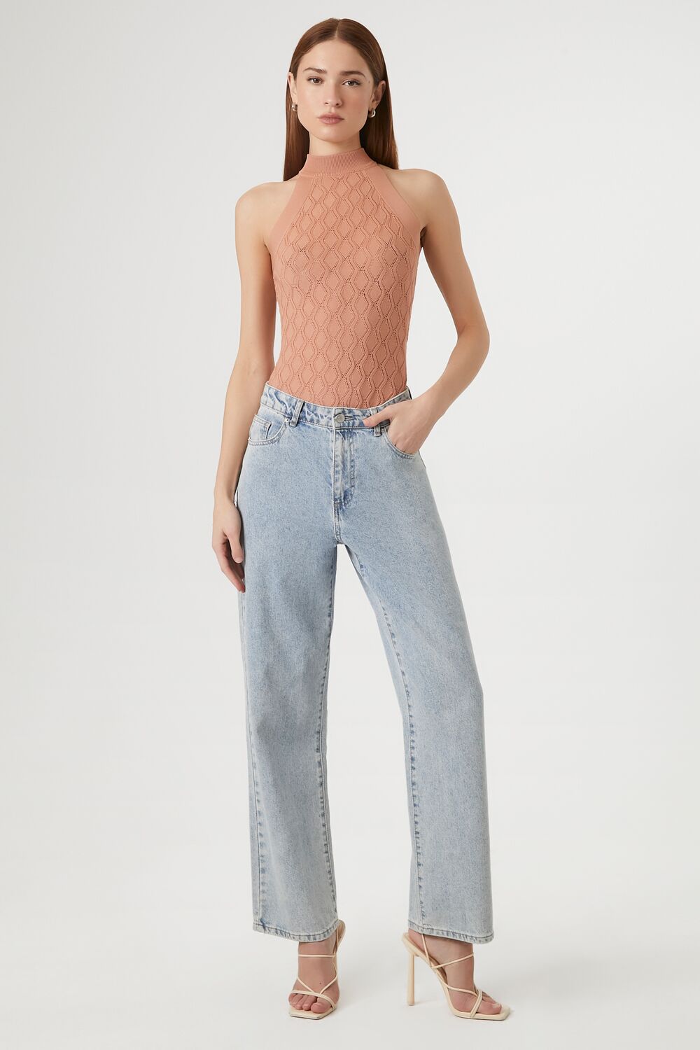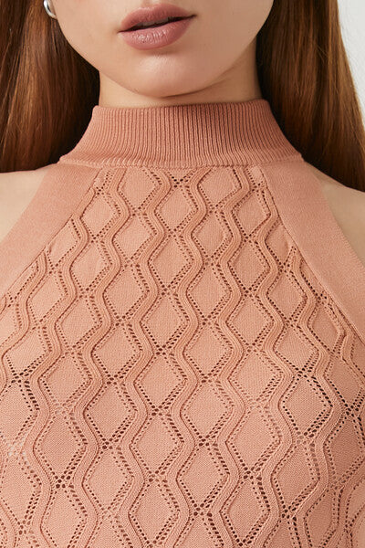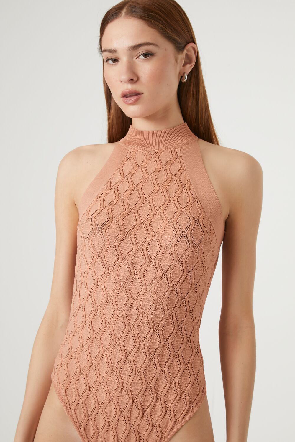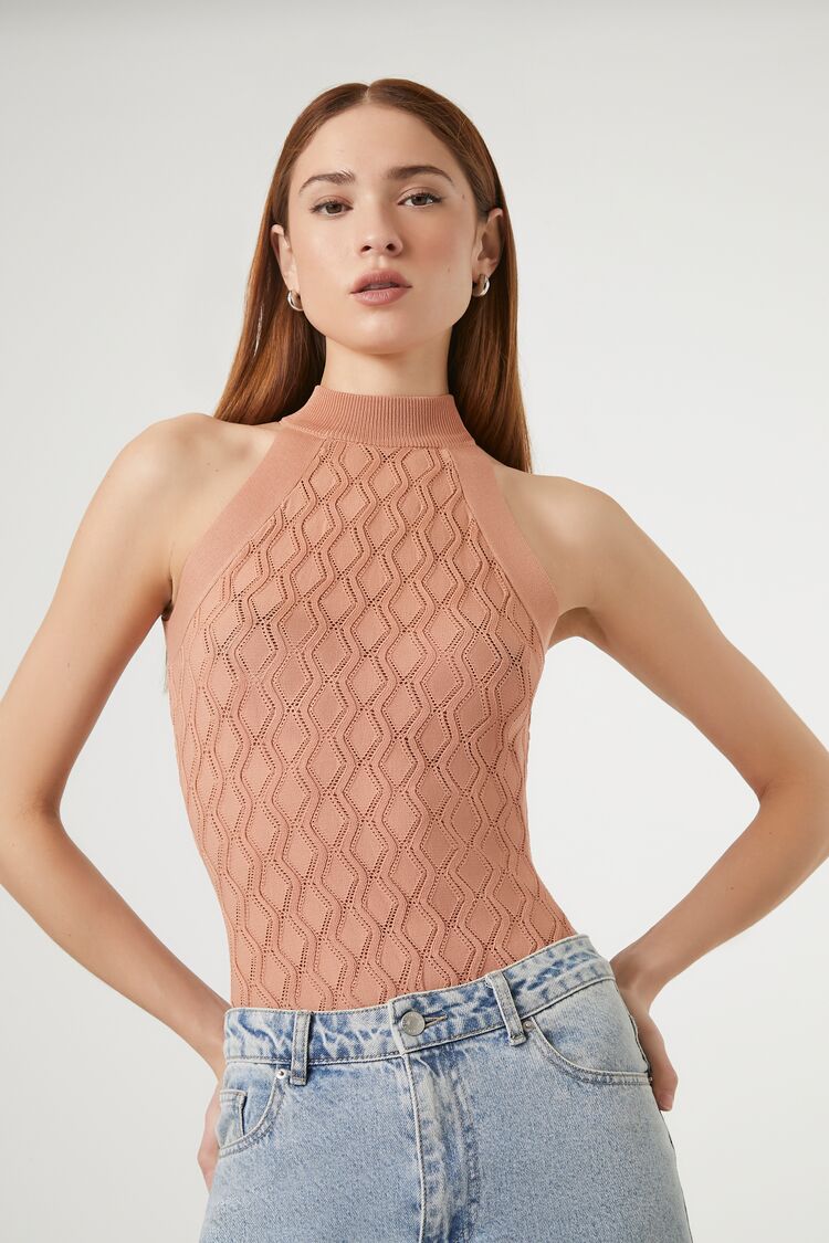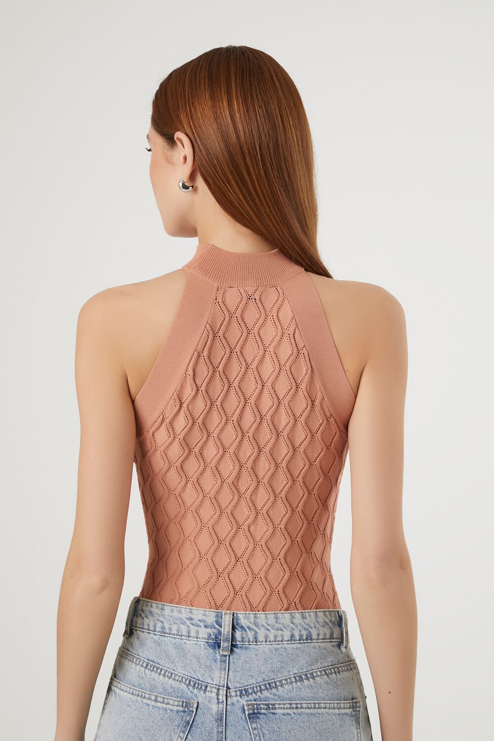 A sweater-knit bodysuit featuring a high neck. ribbed trim. Pointelle knit lattice pattern. racerback. and a sleeveless cut.