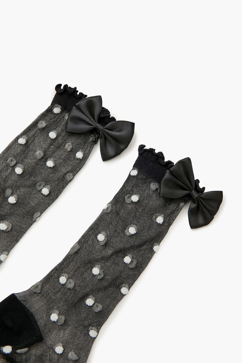 A pair of sheer mesh socks featuring an allover polka dot pattern. crew length. front bow embellishment. and lettuce-edge trim.