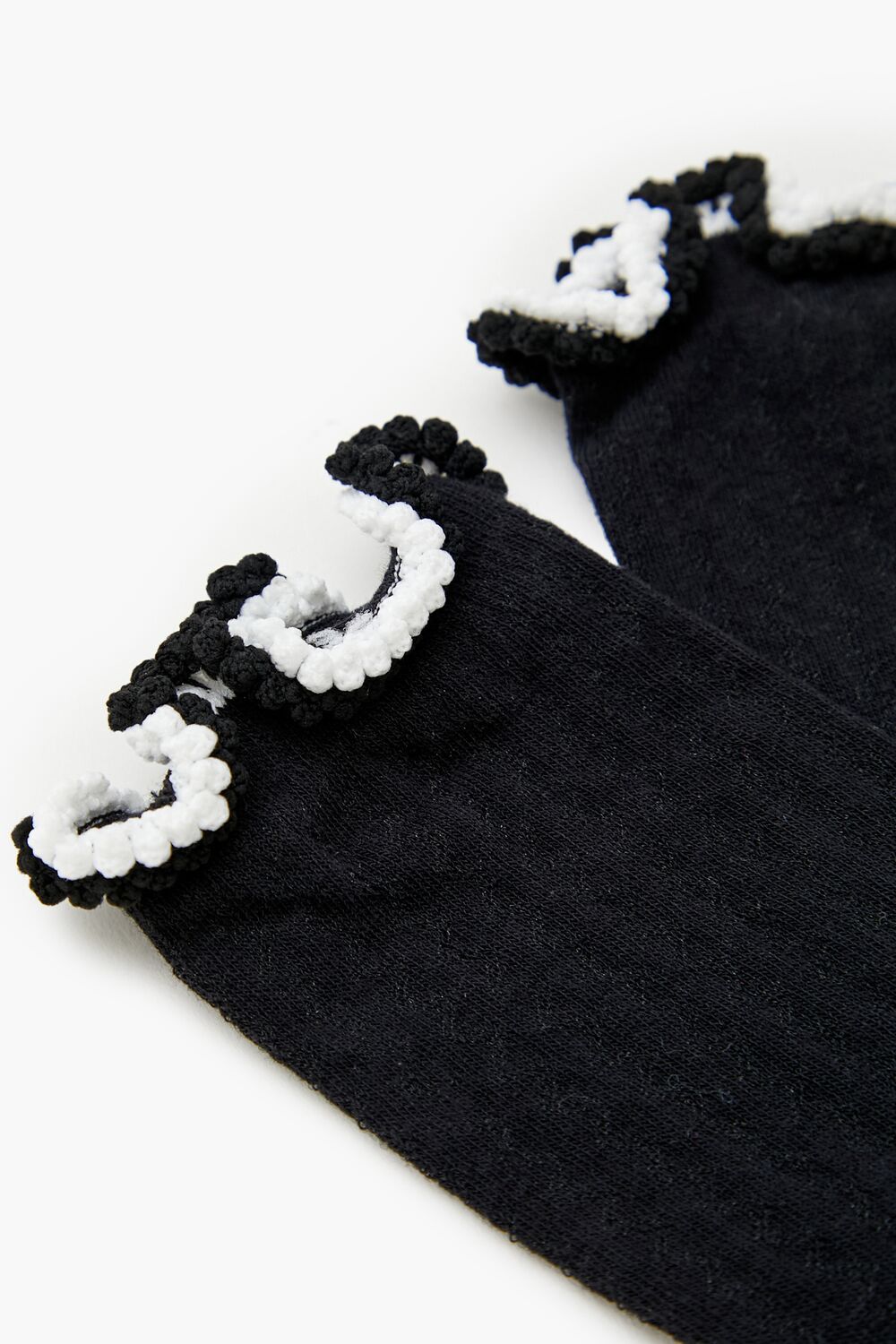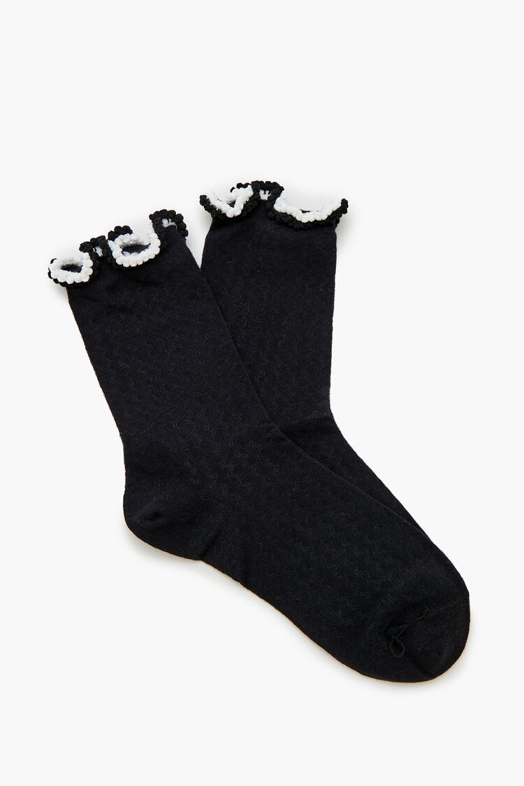 A pair of ribbed knit crew socks featuring two-tone lettuce-edge trim with pom pom embellishments.