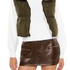 A woven vest featuring a cropped hem. quilted construction. funnel neck. zip-up closure. and slant front pockets.