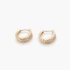 A set of high-polish hoop earrings featuring rhinestone embellishments. geometric designs. an open ended construction. post-back closures. and a huggie pair with infinity closures.