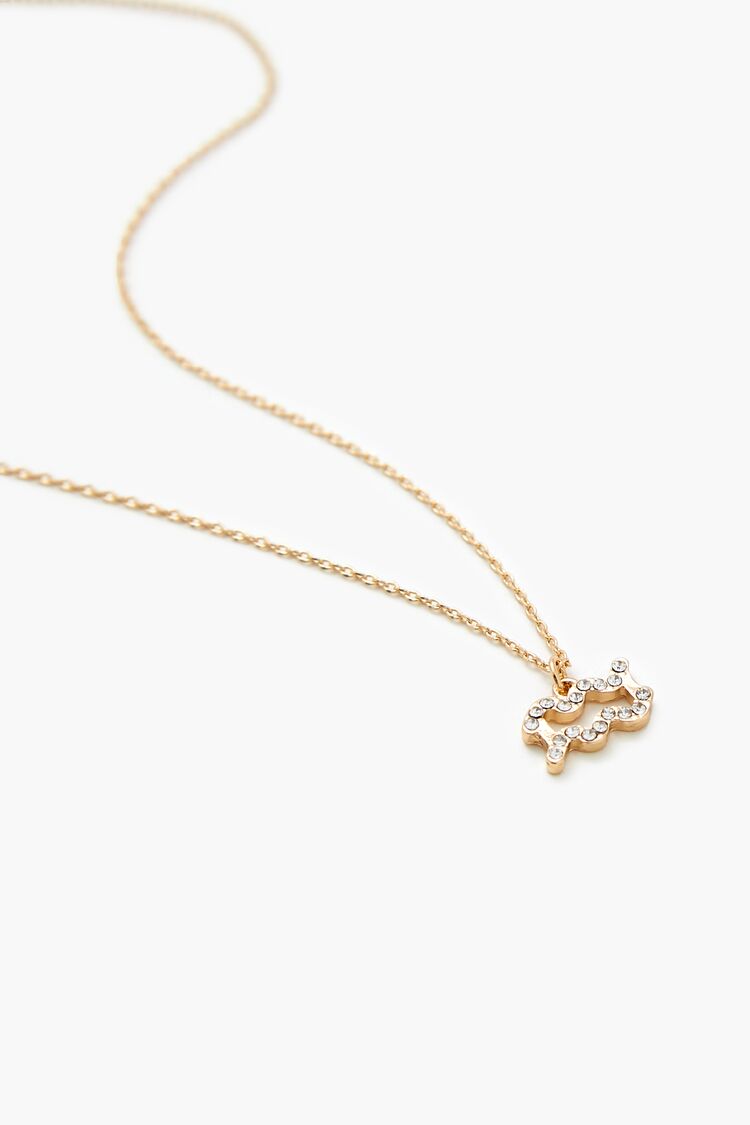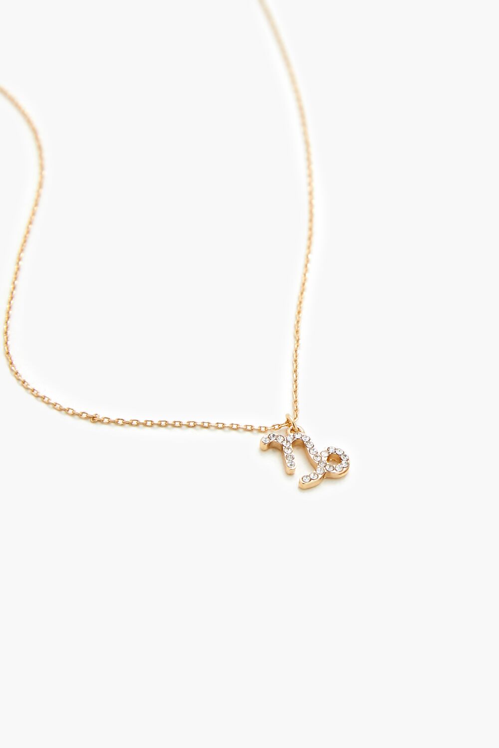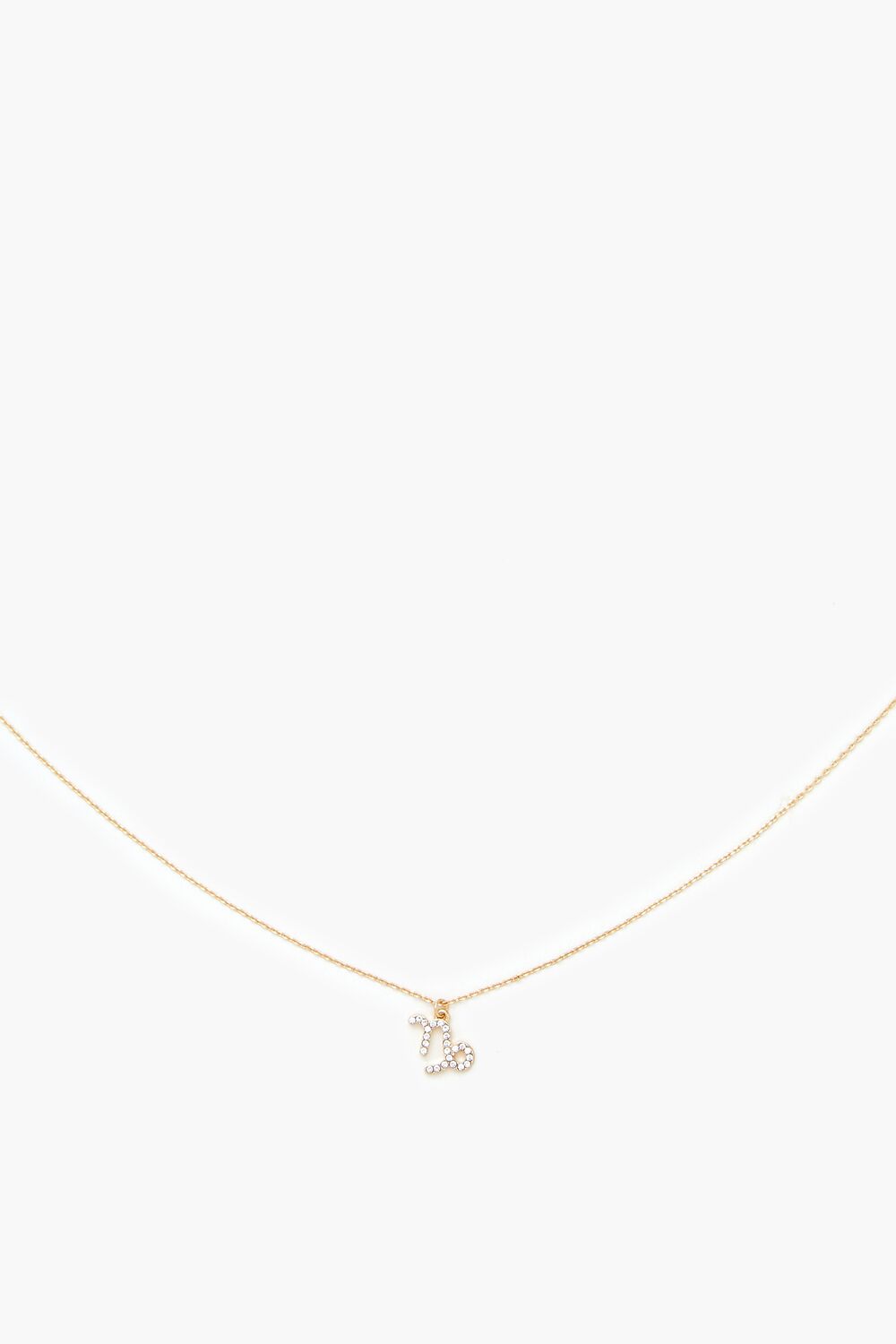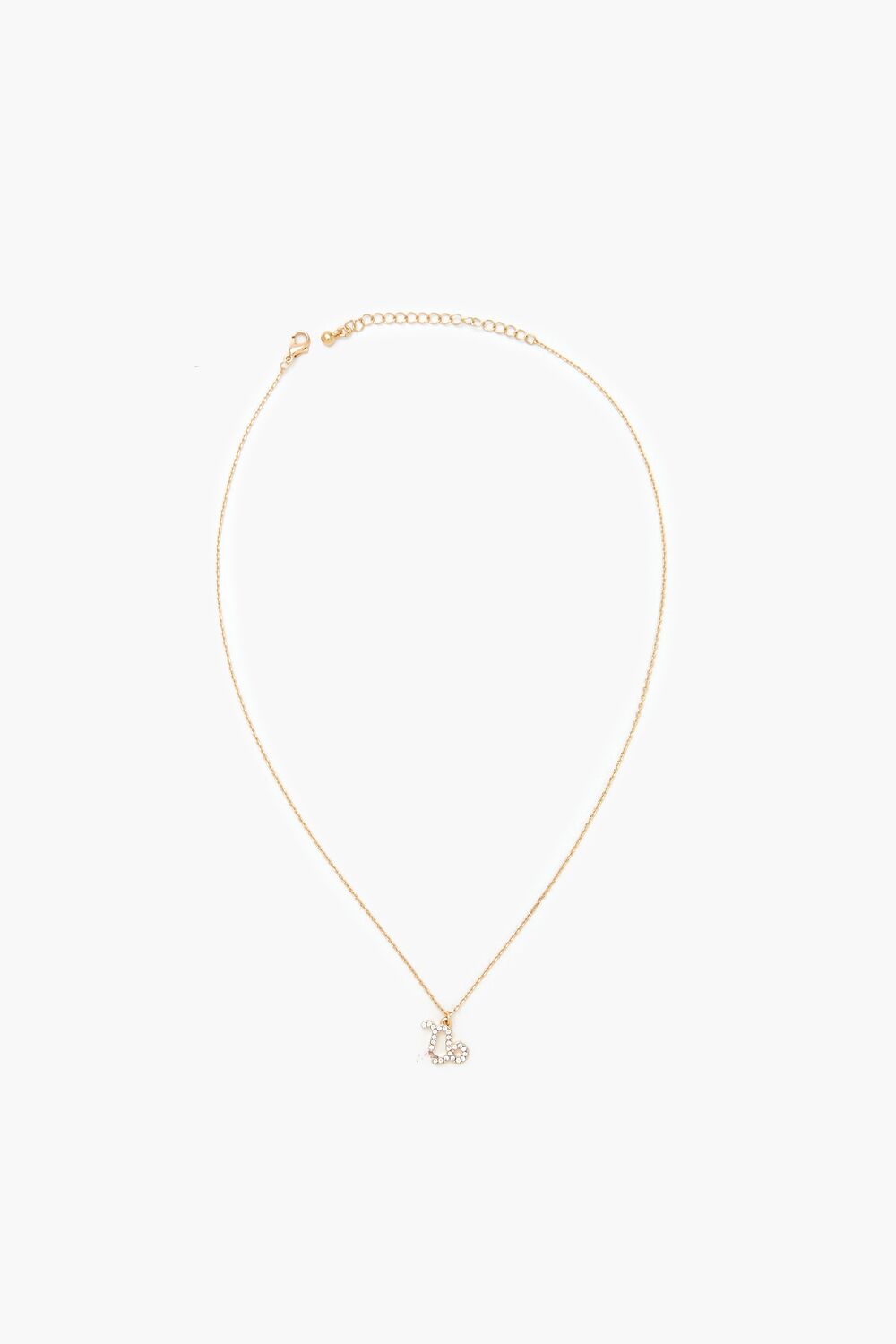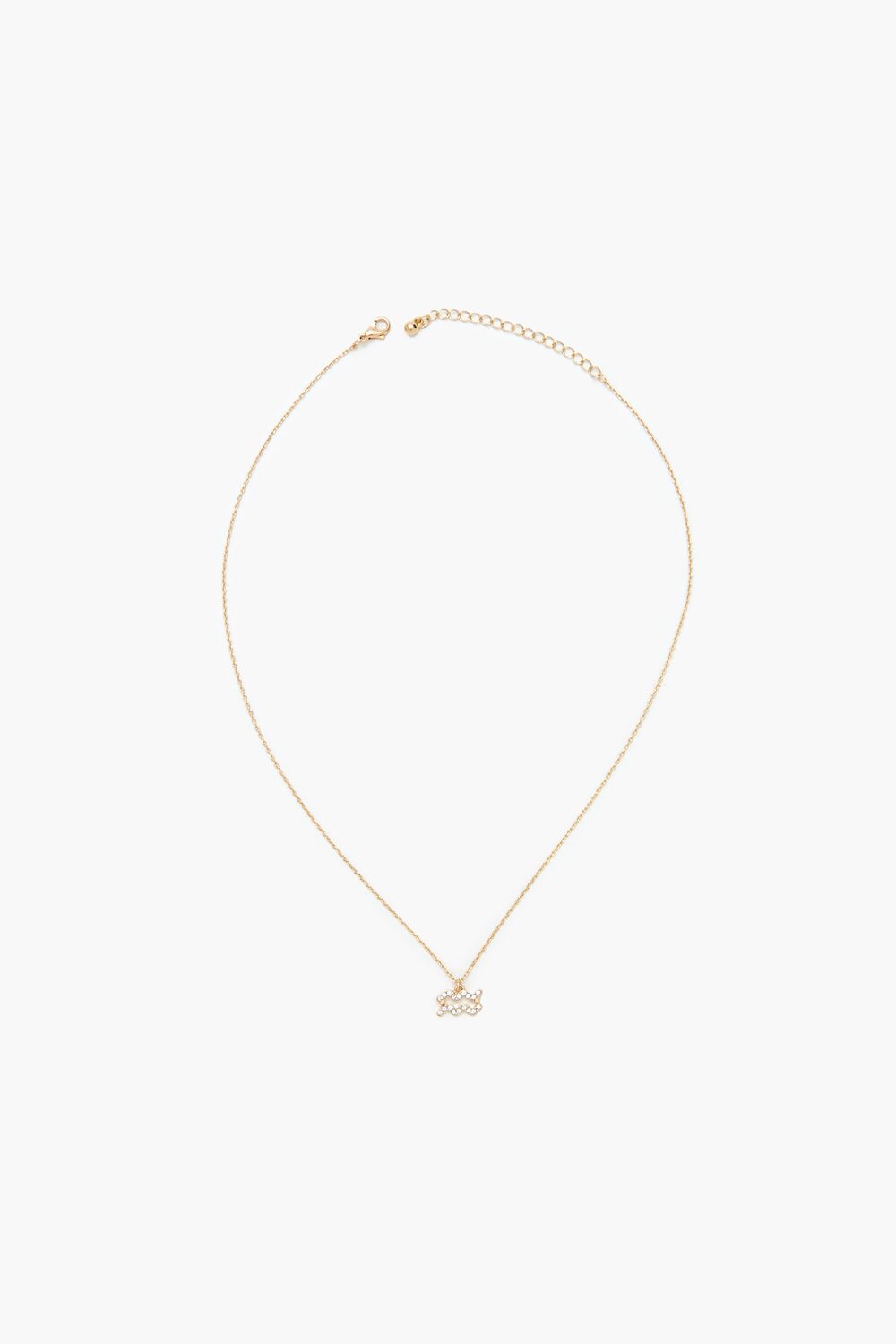 A high-polish necklace featuring a cable chain. centered zodiac sign charm. rhinestone embellishments. and lobster-clasp closure.