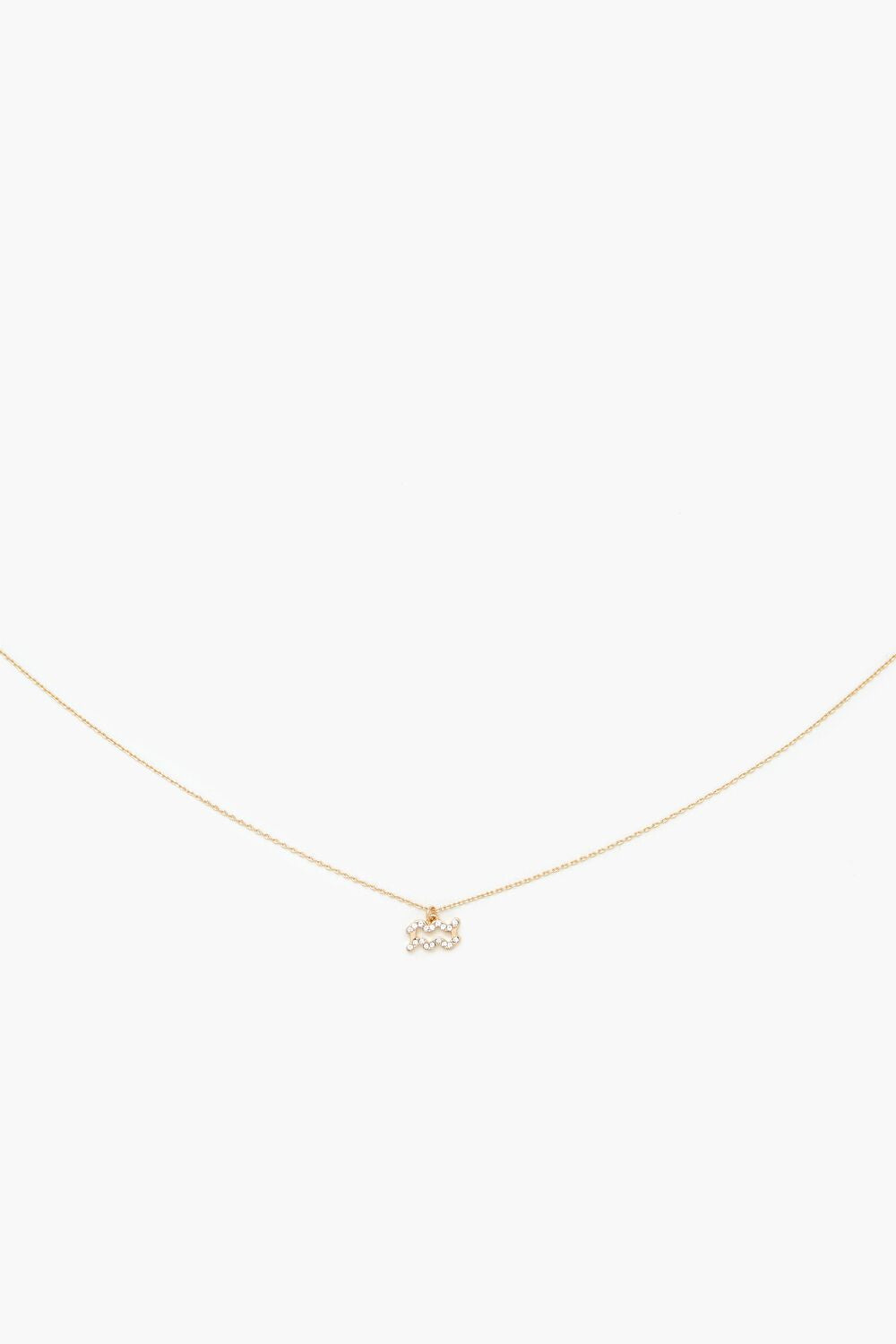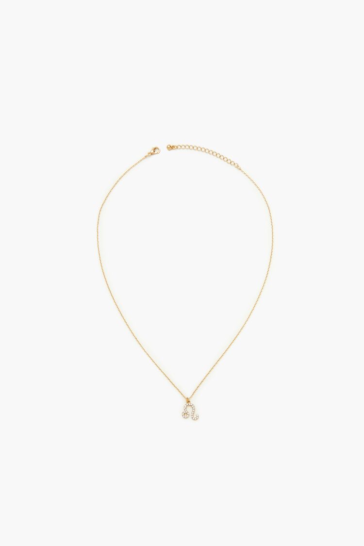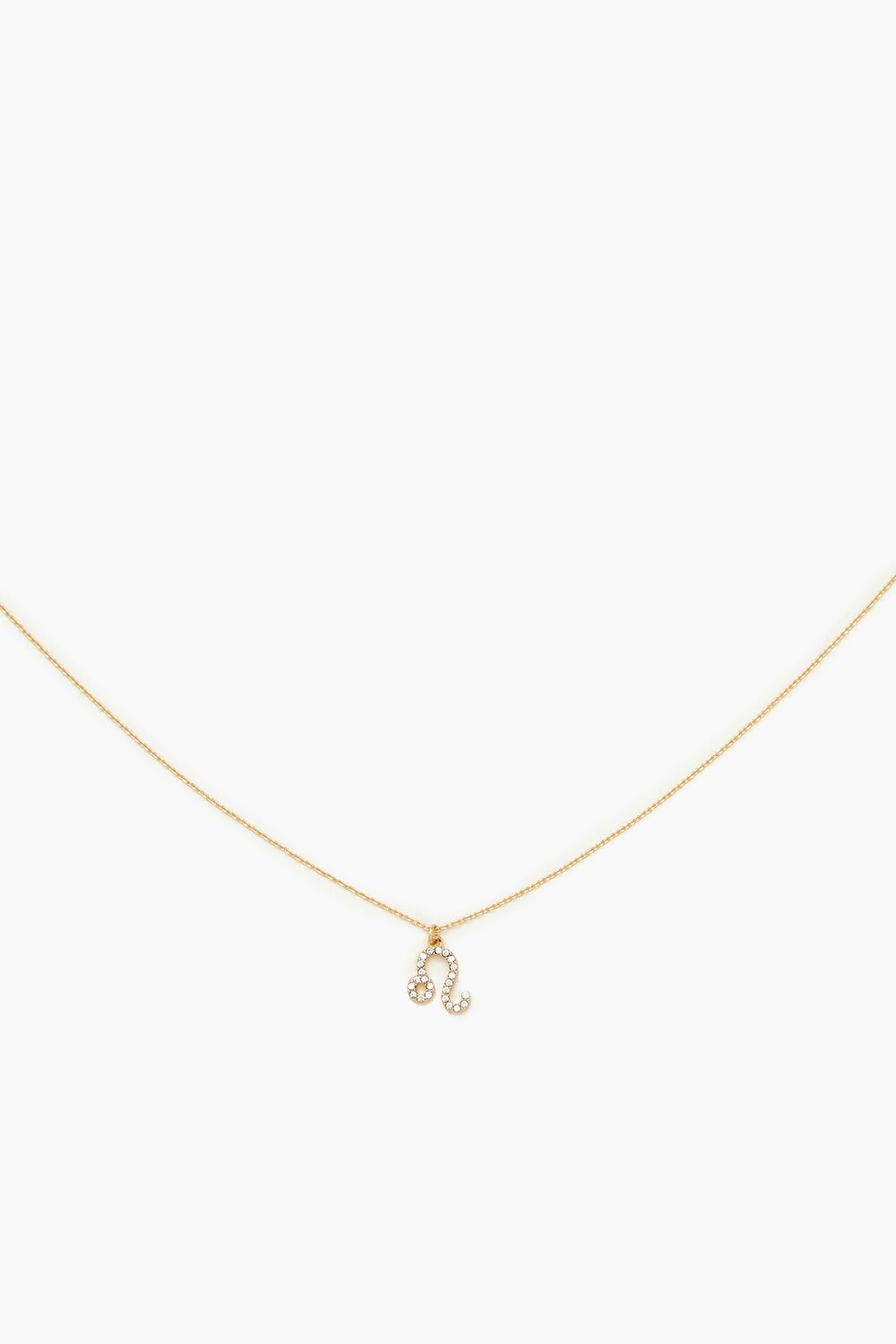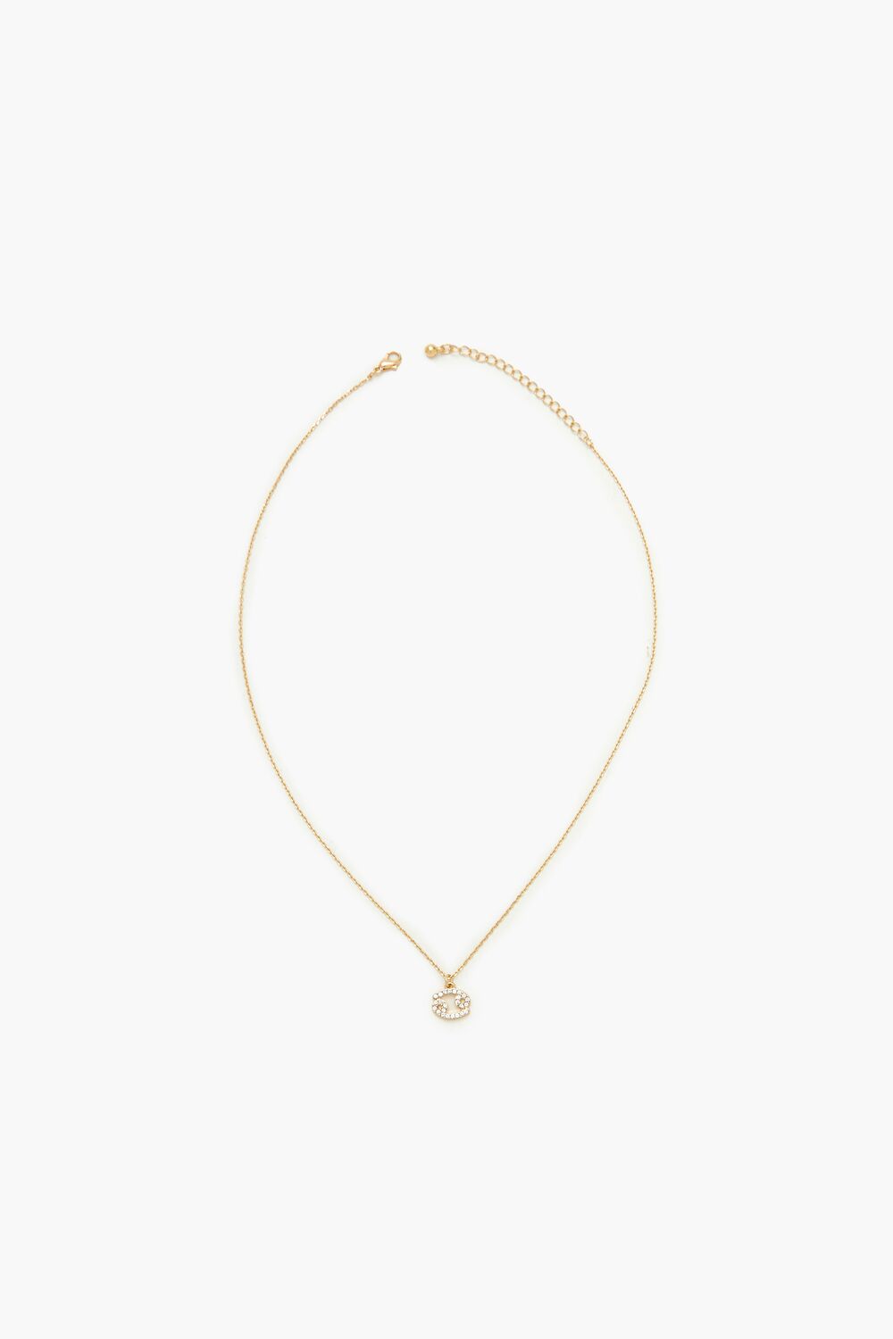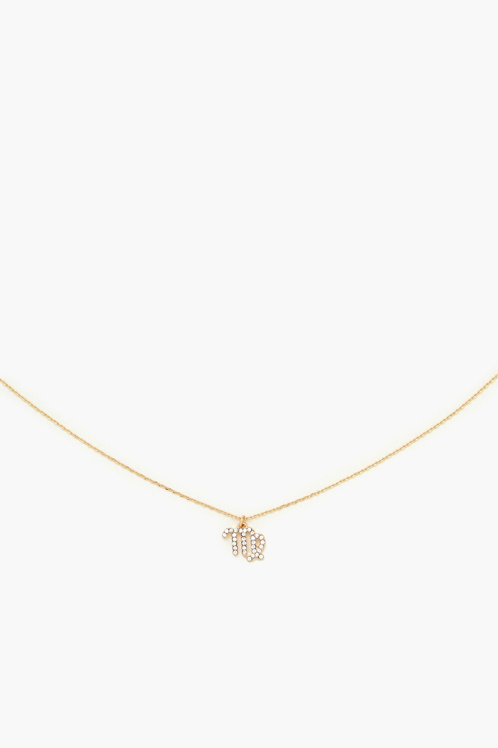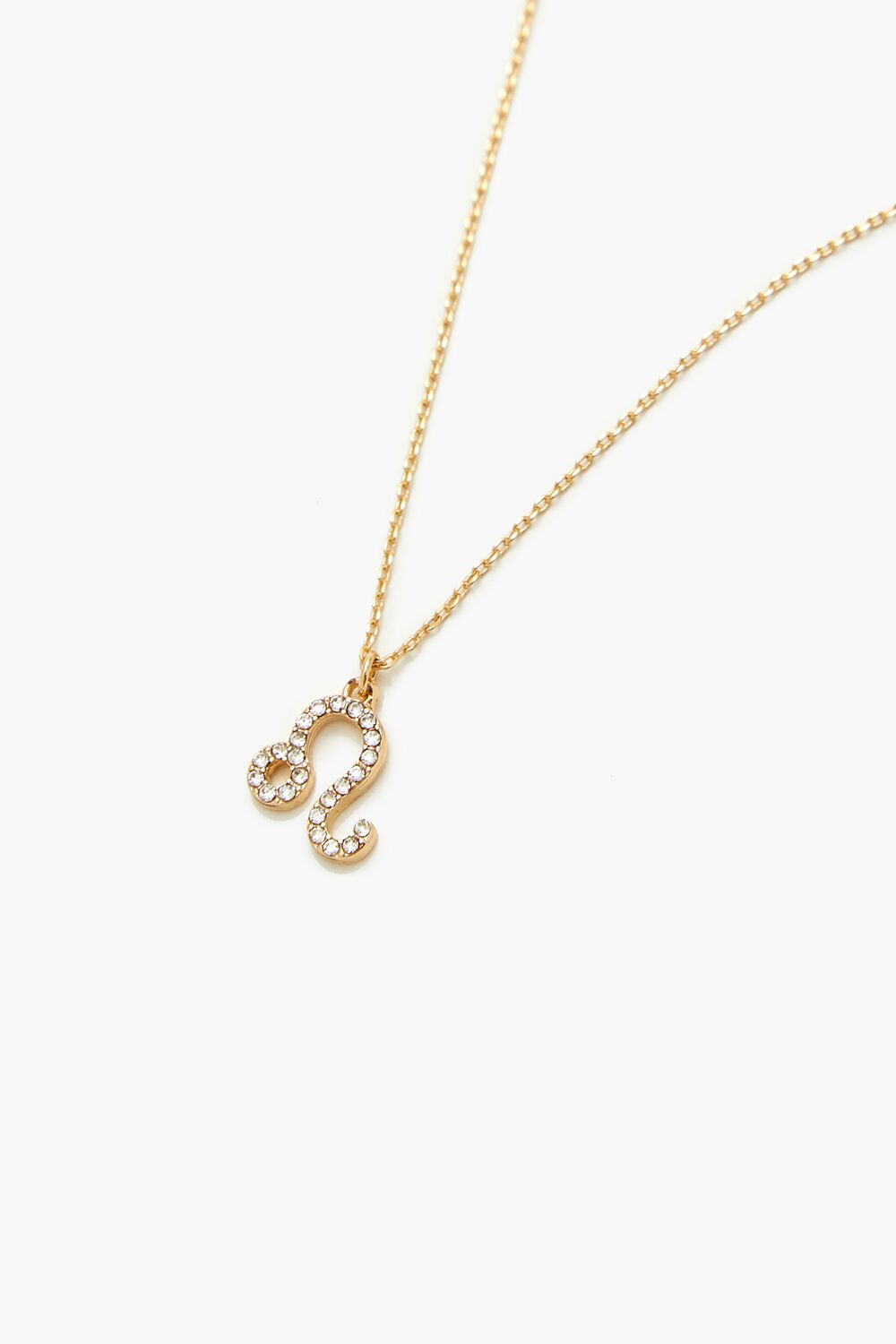 A high-polish necklace featuring a cable chain. centered zodiac sign charm. rhinestone embellishments. and lobster-clasp closure.