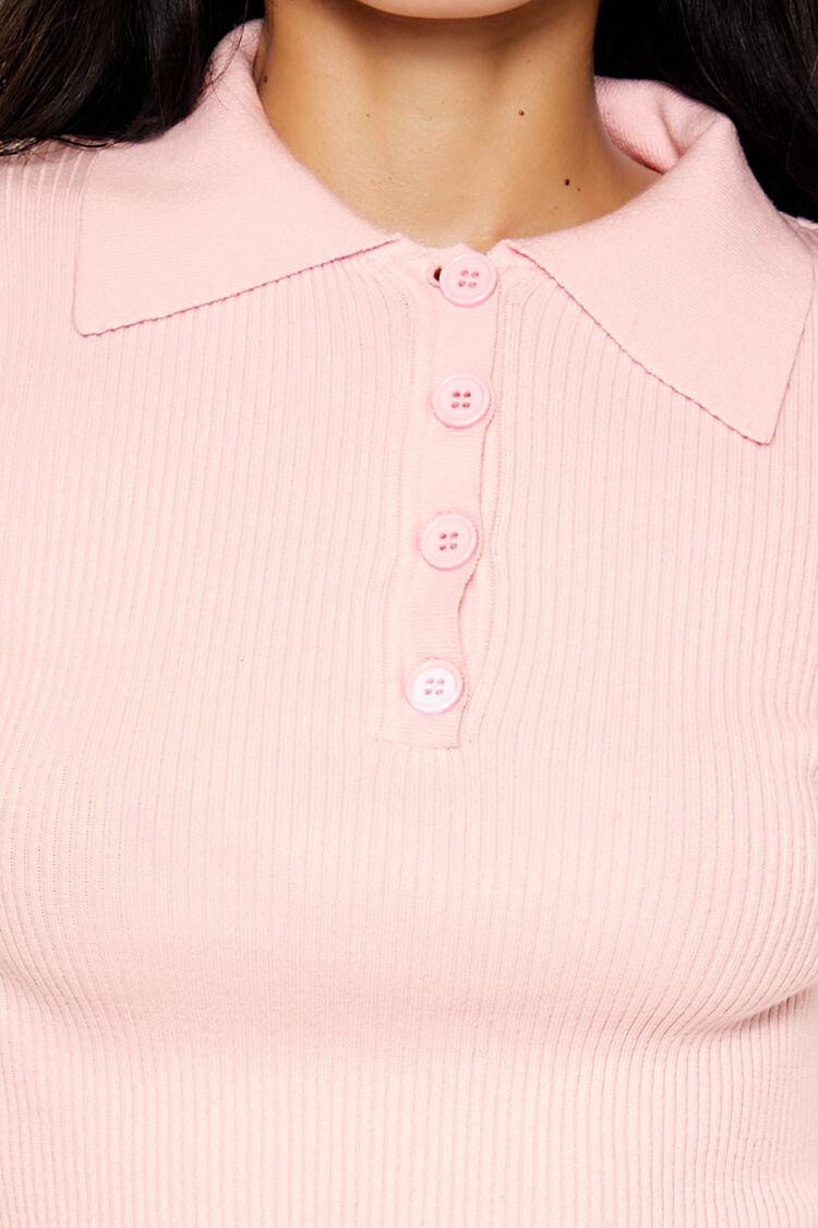 A ribbed knit sweater featuring a round neckline. partial button placket. long sleeves. and a cropped hem.