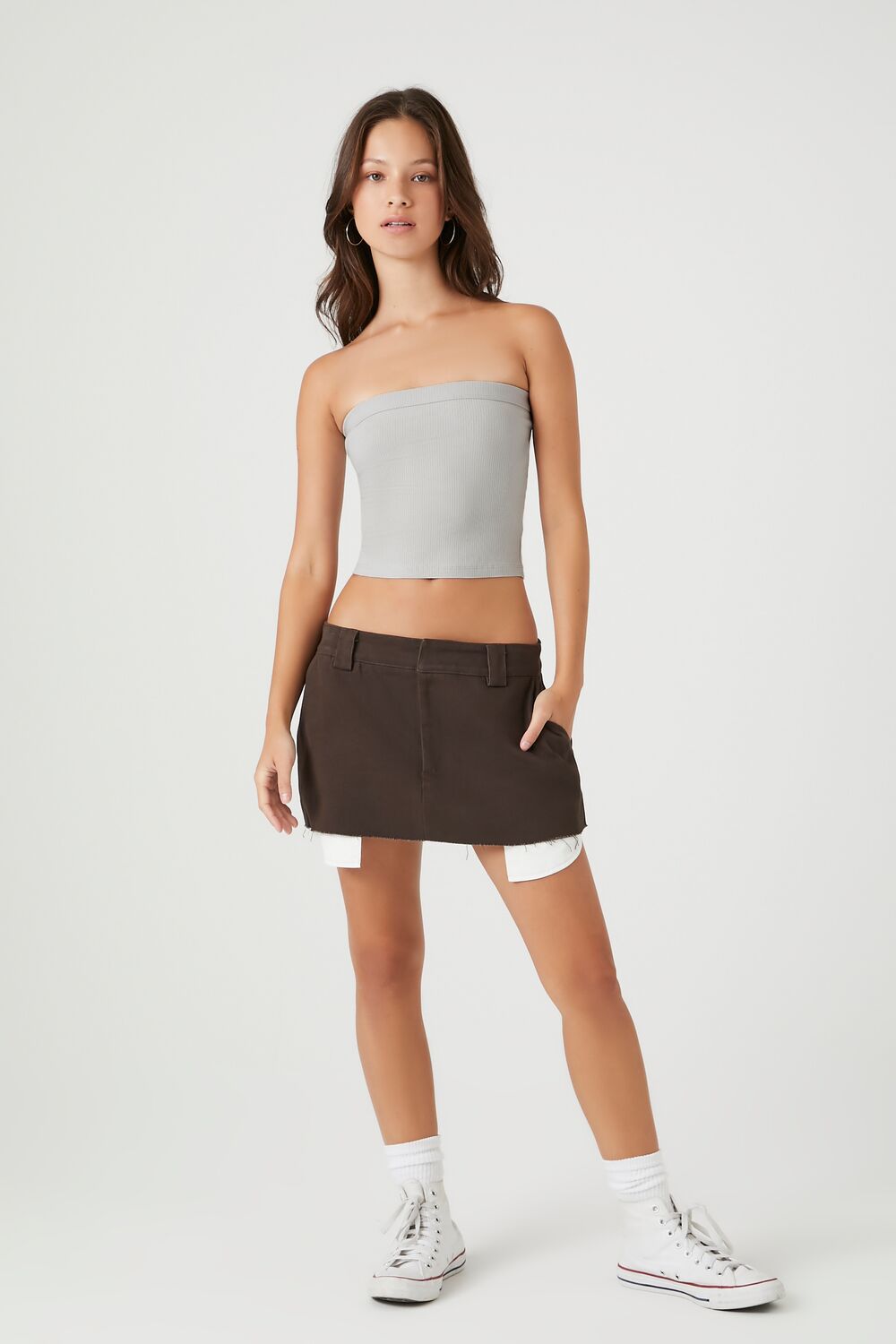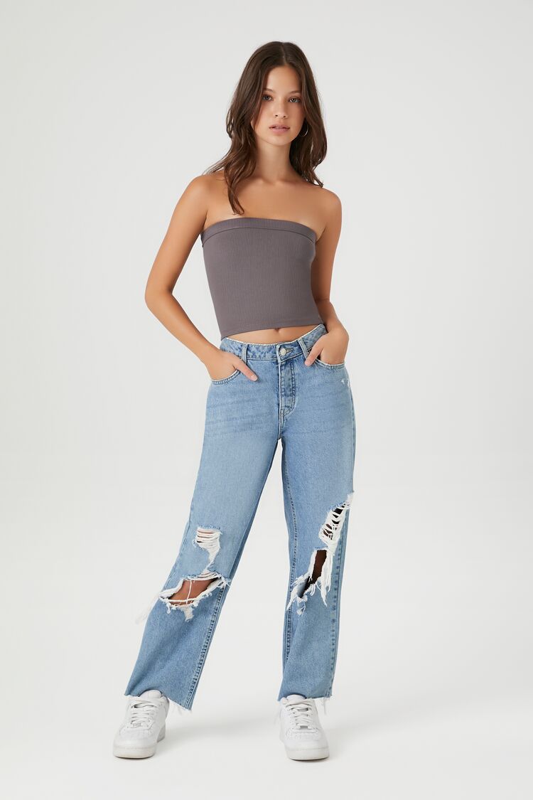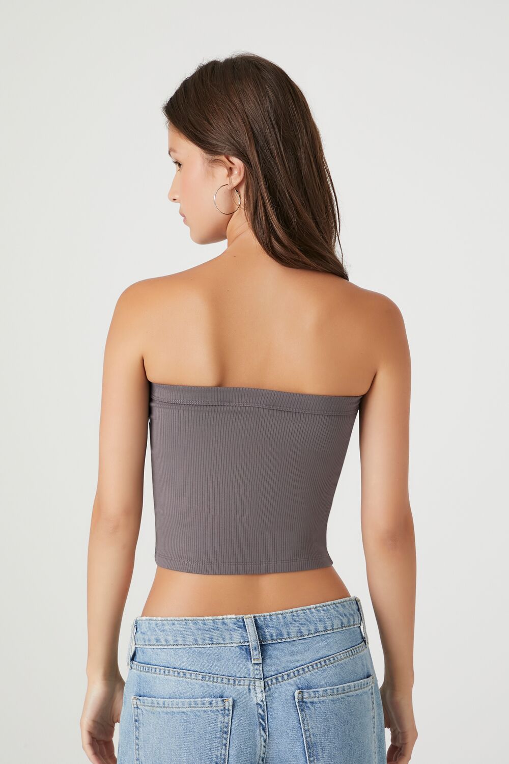 A ribbed knit tube top featuring a straight-cut neckline and semi-cropped hem.