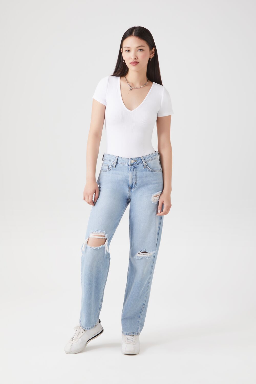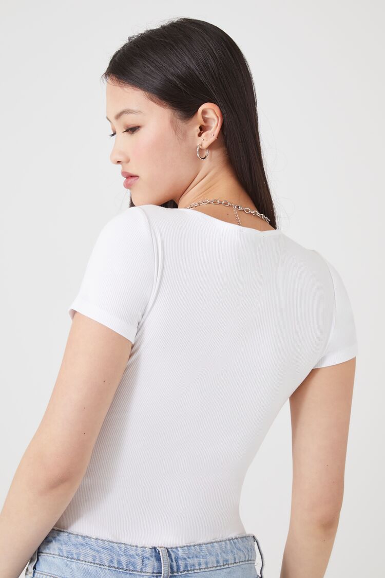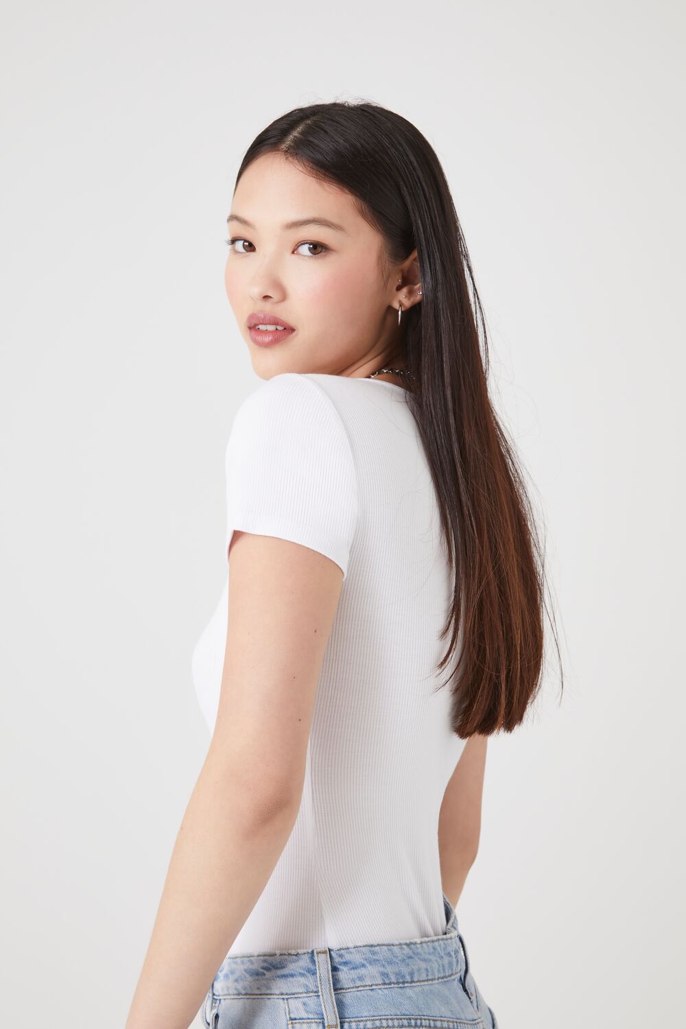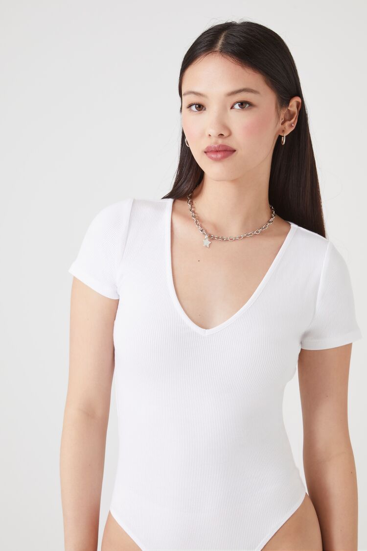 A ribbed knit bodysuit featuring an allover ribbed construction. V-neckline. short sleeves. and snap-button closures.