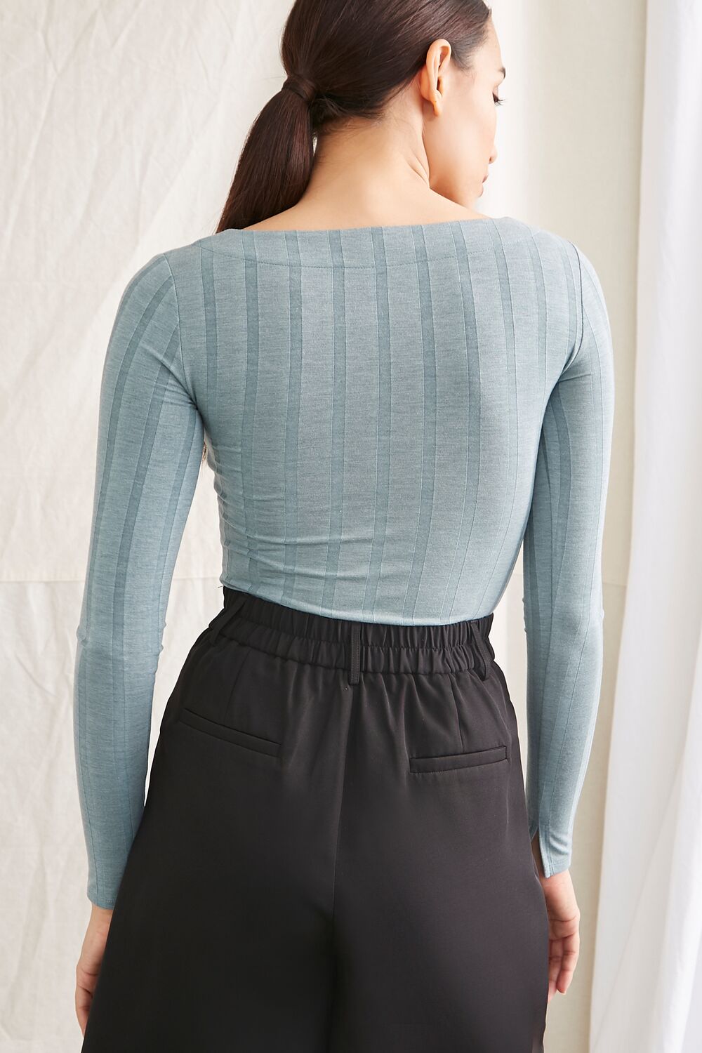 A wide-ribbed bodysuit featuring a square neckline and long sleeves.