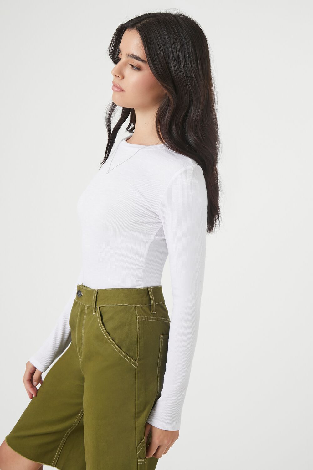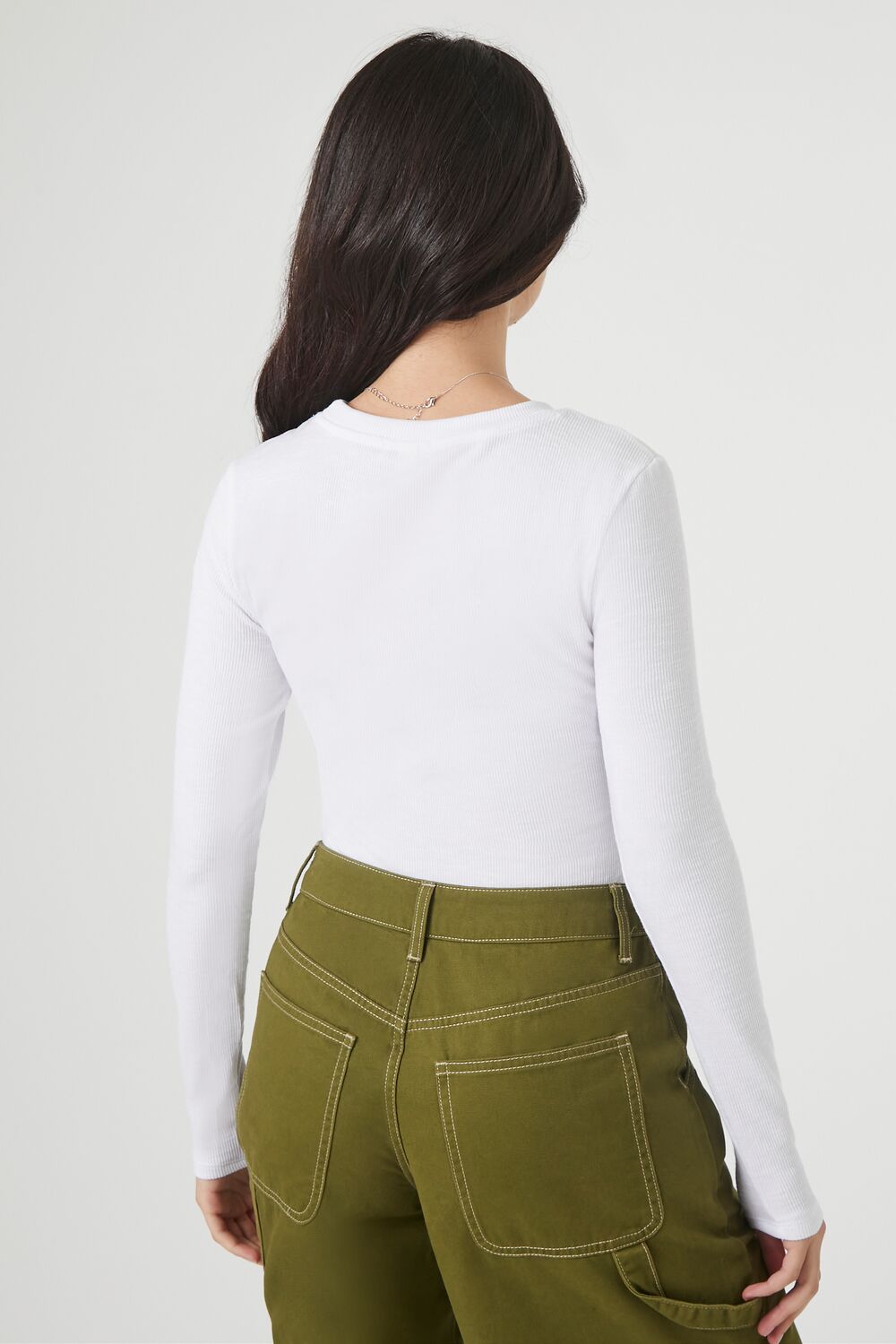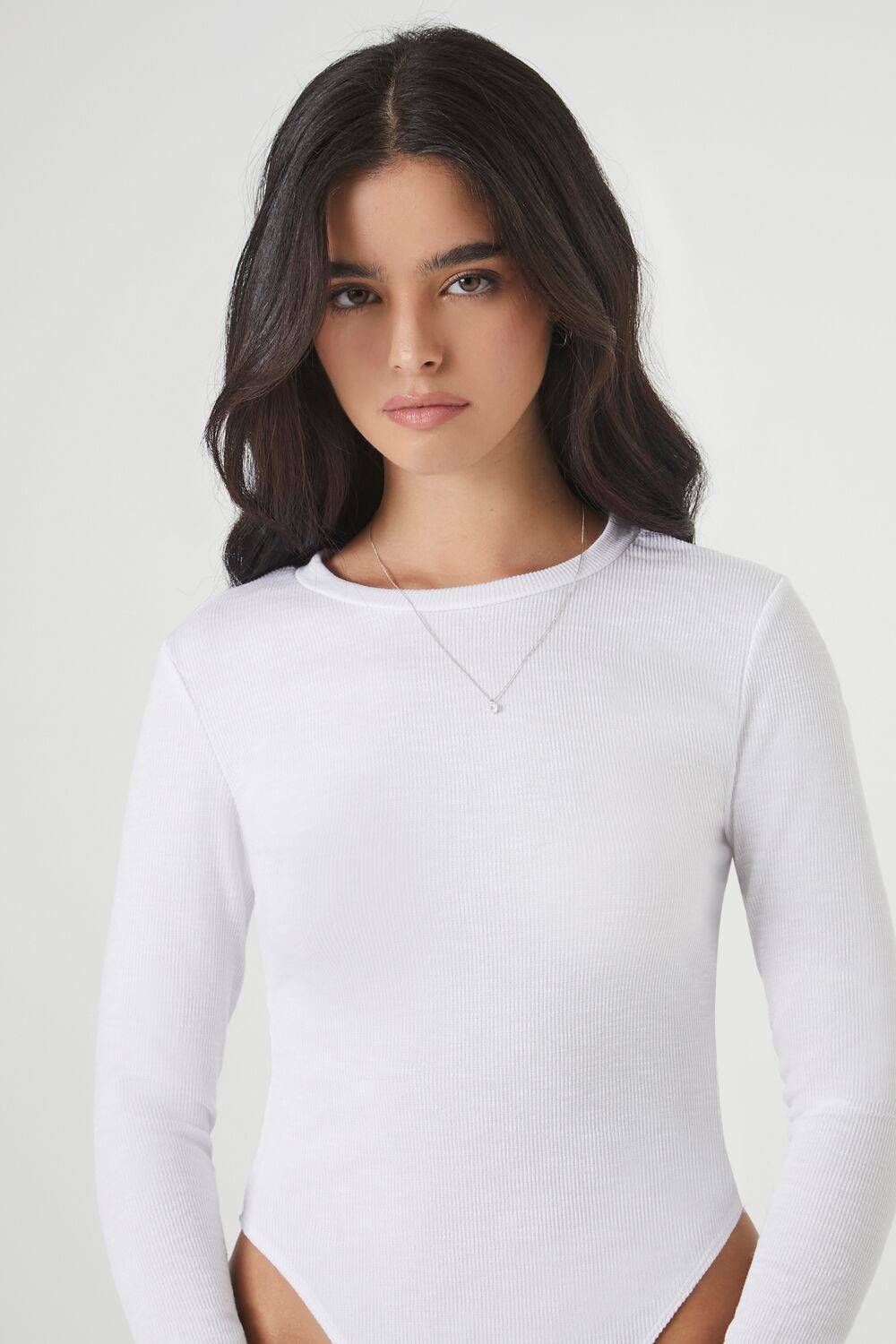A knit bodysuit featuring a round neckline. long sleeves. and allover ribbed construction.
