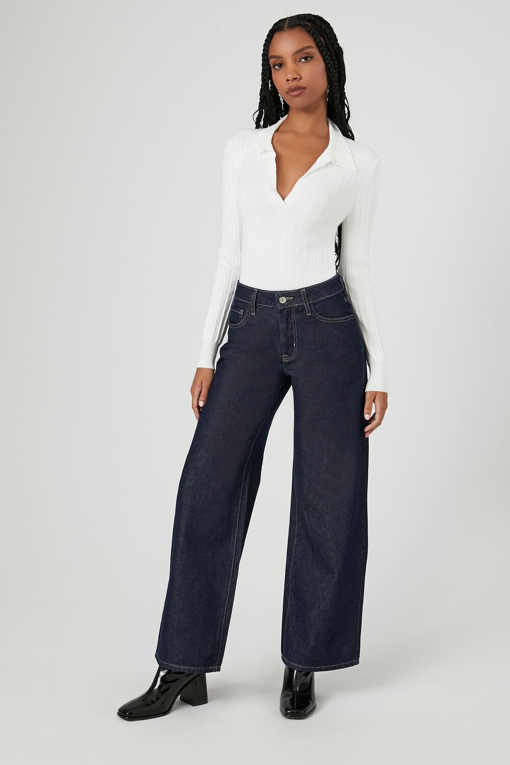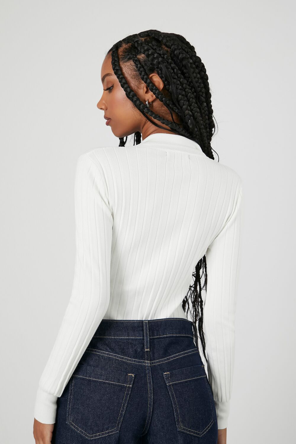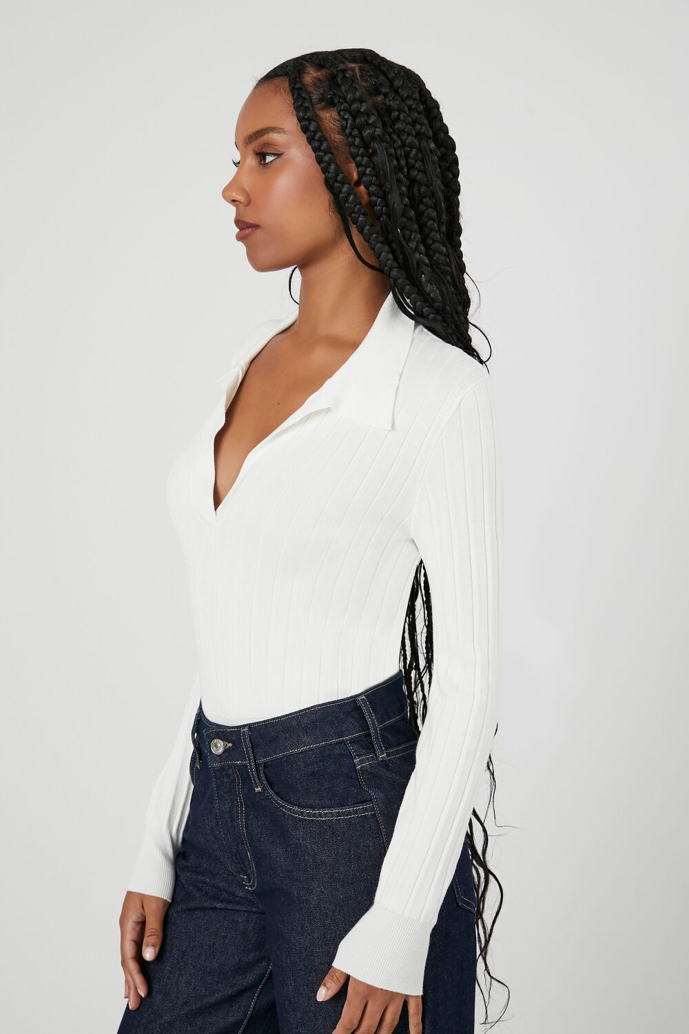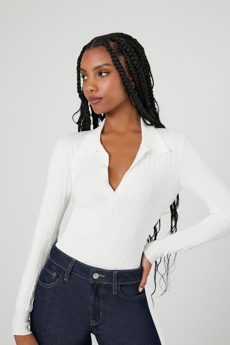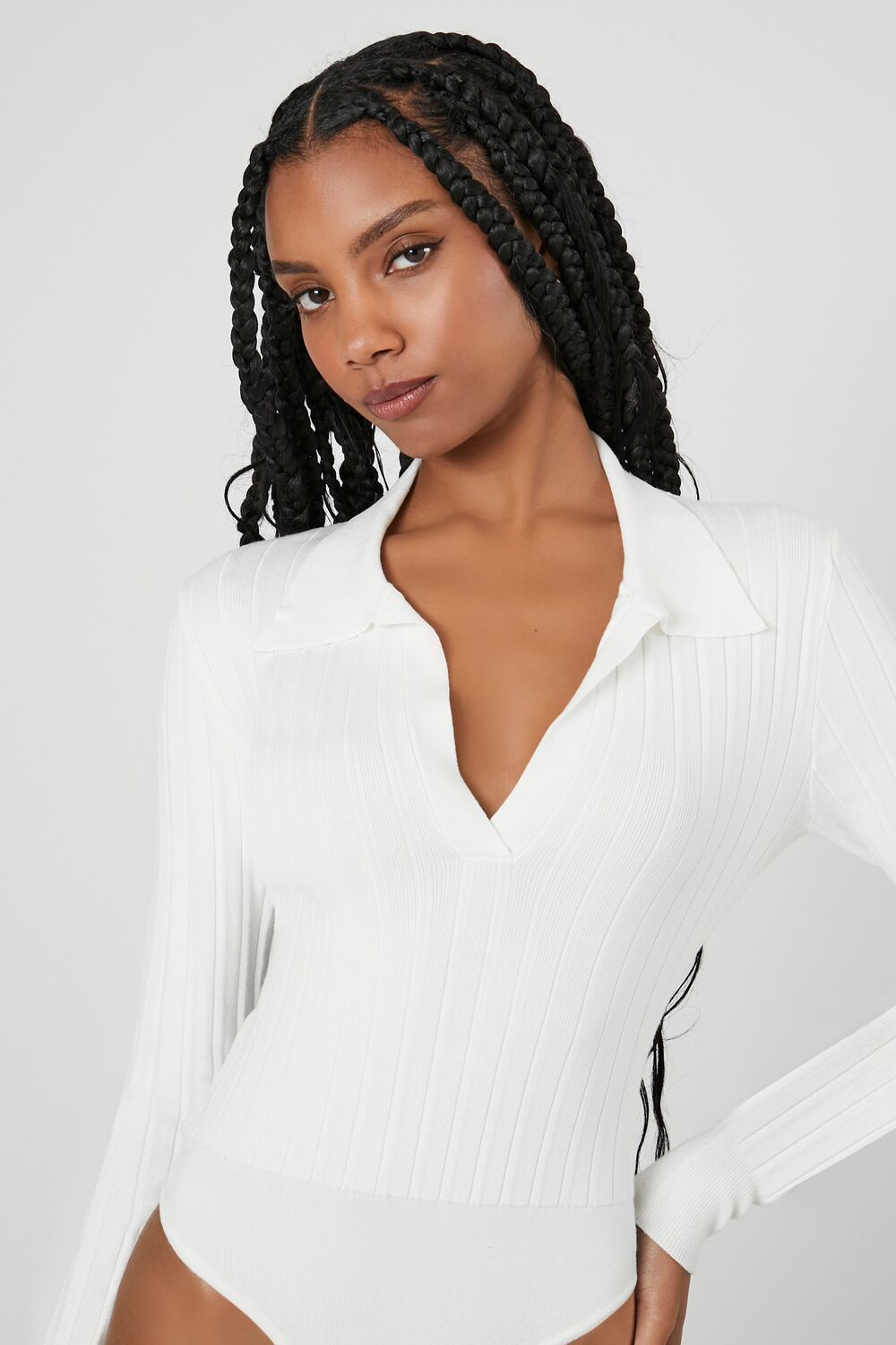 A sweater-knit bodysuit featuring an allover ribbed construction. basic collar. split neckline. and long sleeves.
